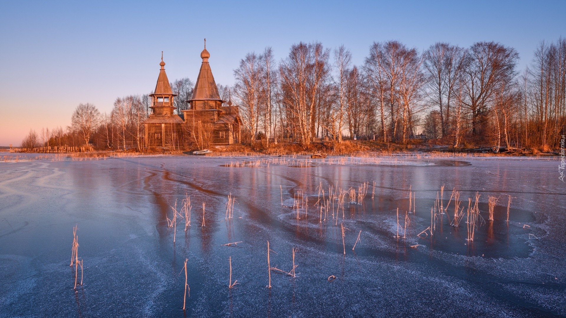 Edytor tapety: Cerkiew nad zamarzniętym jeziorem we wsi Chelmuzhi