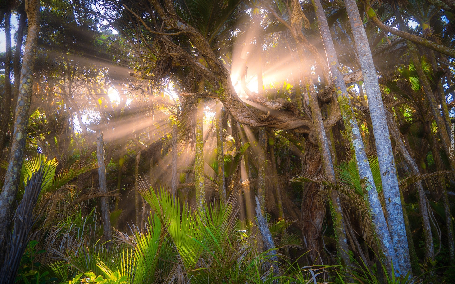 Edytor tapety: Rozświetlone słońcem drzewa i liście w lesie