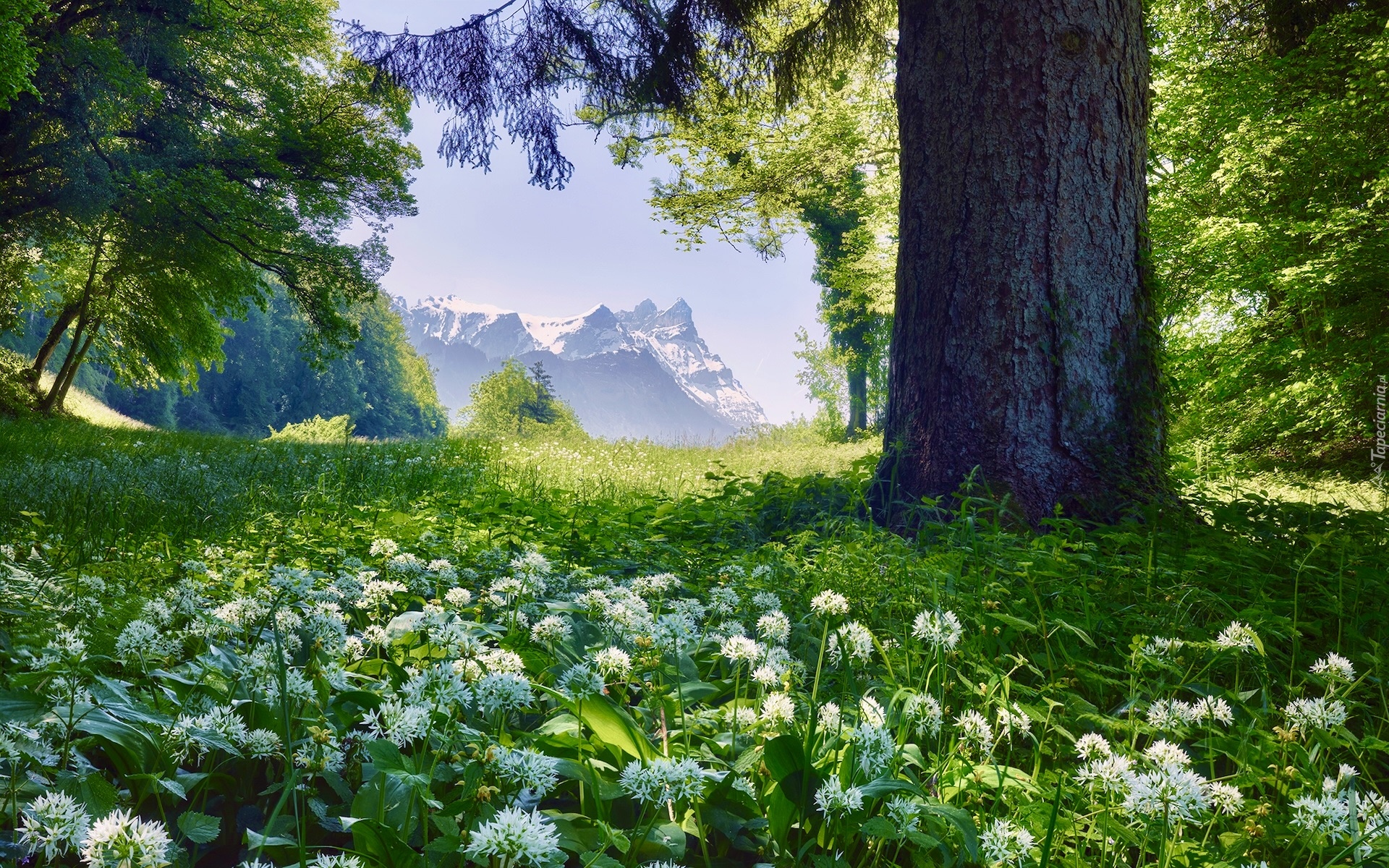Edytor tapety: Rozświetlony czosnek niedźwiedzi pod drzewami na tle gór