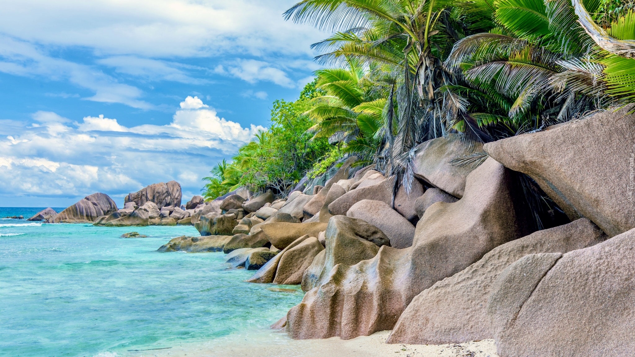 Edytor tapety: Palmy i skały bazaltowe na plaży Anse Cocos