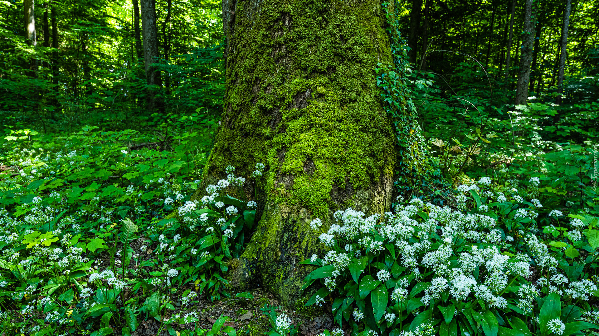 Edytor tapety: Czosnek niedźwiedzi pod omszałym drzewem