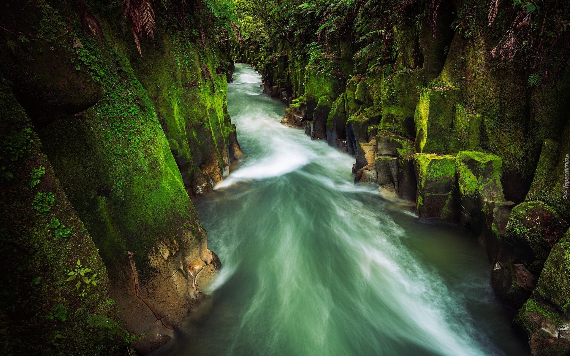 Edytor tapety: Rzeka wśród omszałych skał w Nowej Zelandii