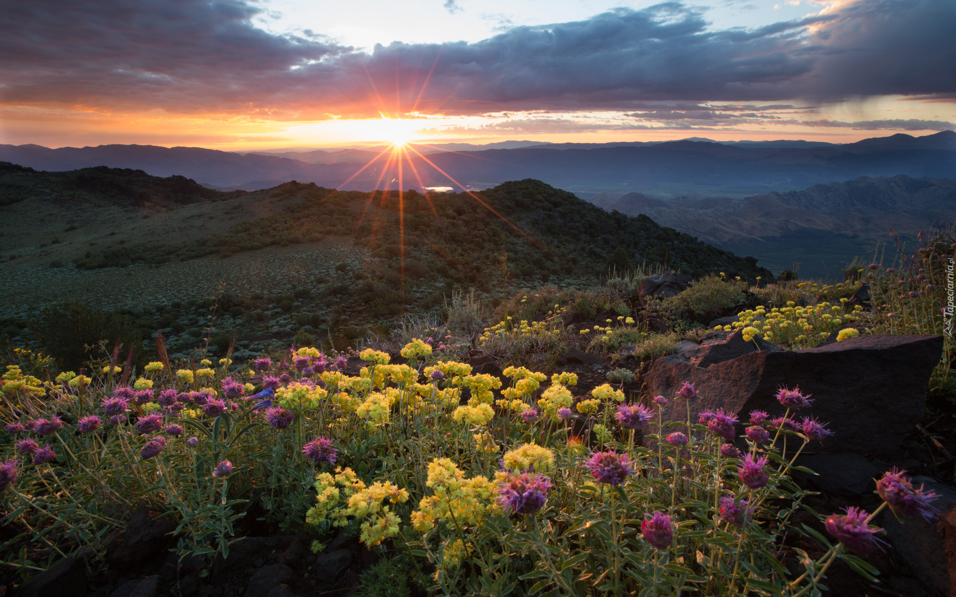 Edytor tapety: Rozświetlone kwiaty na tle wschodu słońca nad górami