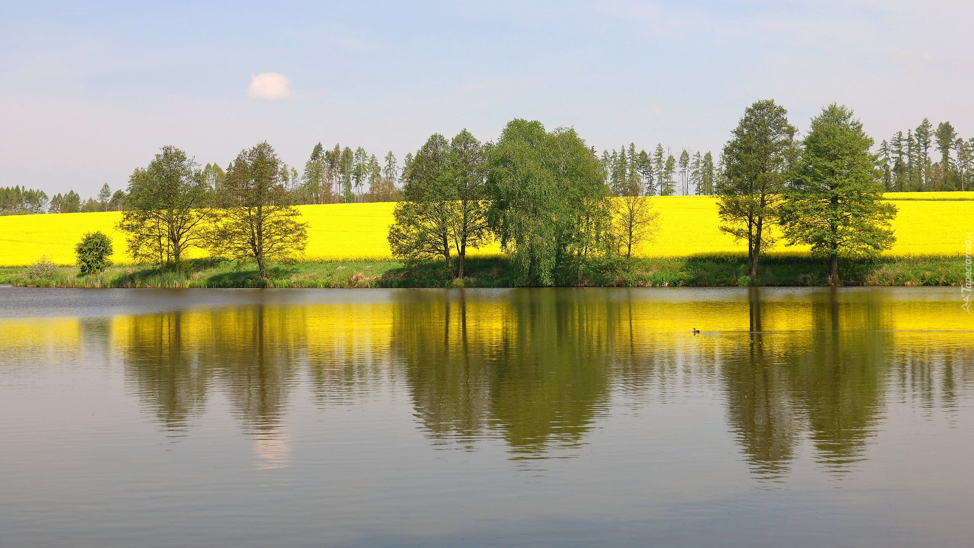 Edytor tapety: Rozświetlone pole rzepaku i drzewa nad jeziorem