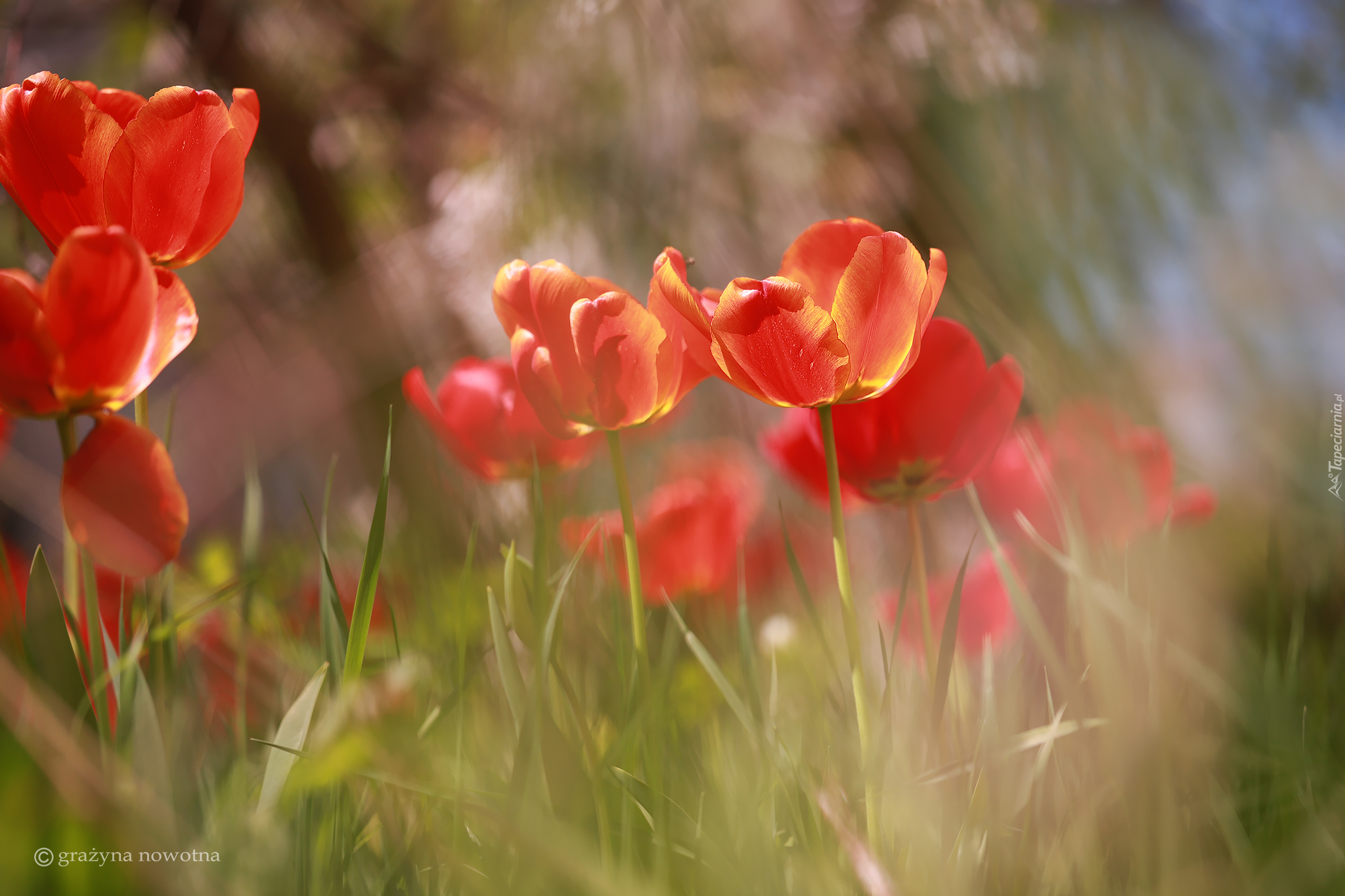 Edytor tapety: Rozkwitnięte czerwone tulipany w rozmyciu