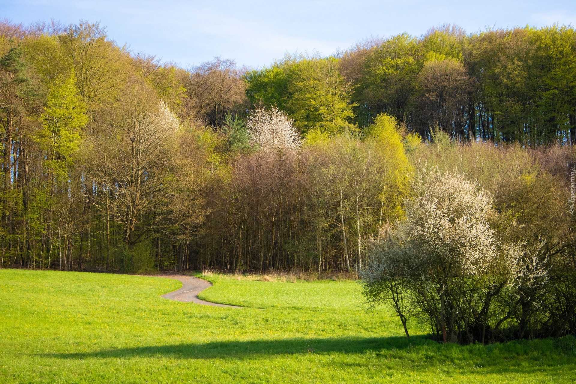 Edytor tapety: Ścieżka przez łąkę do wiosennego lasu