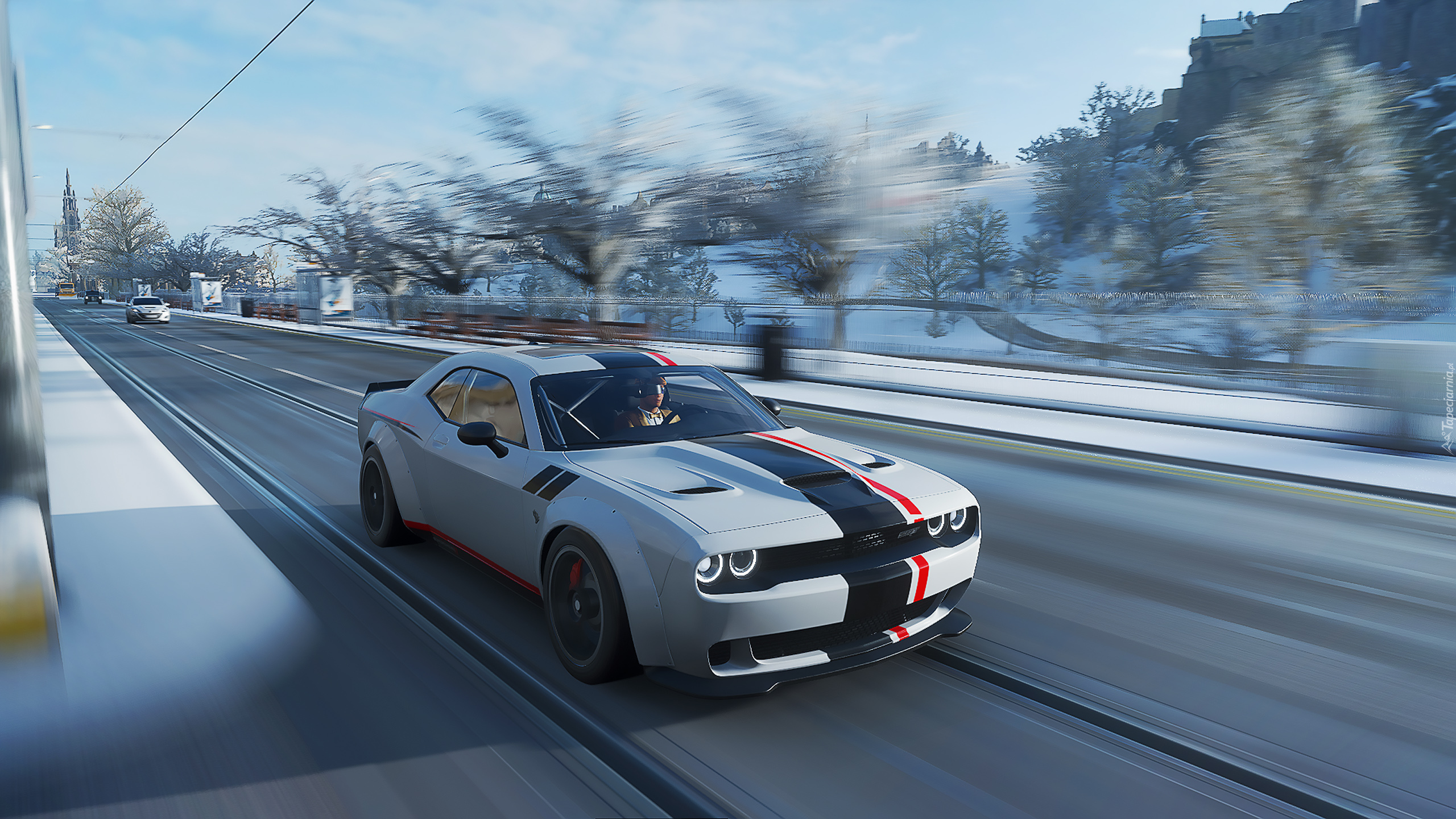Edytor tapety: Biały Dodge Challenger z gry Forza Horizon 4