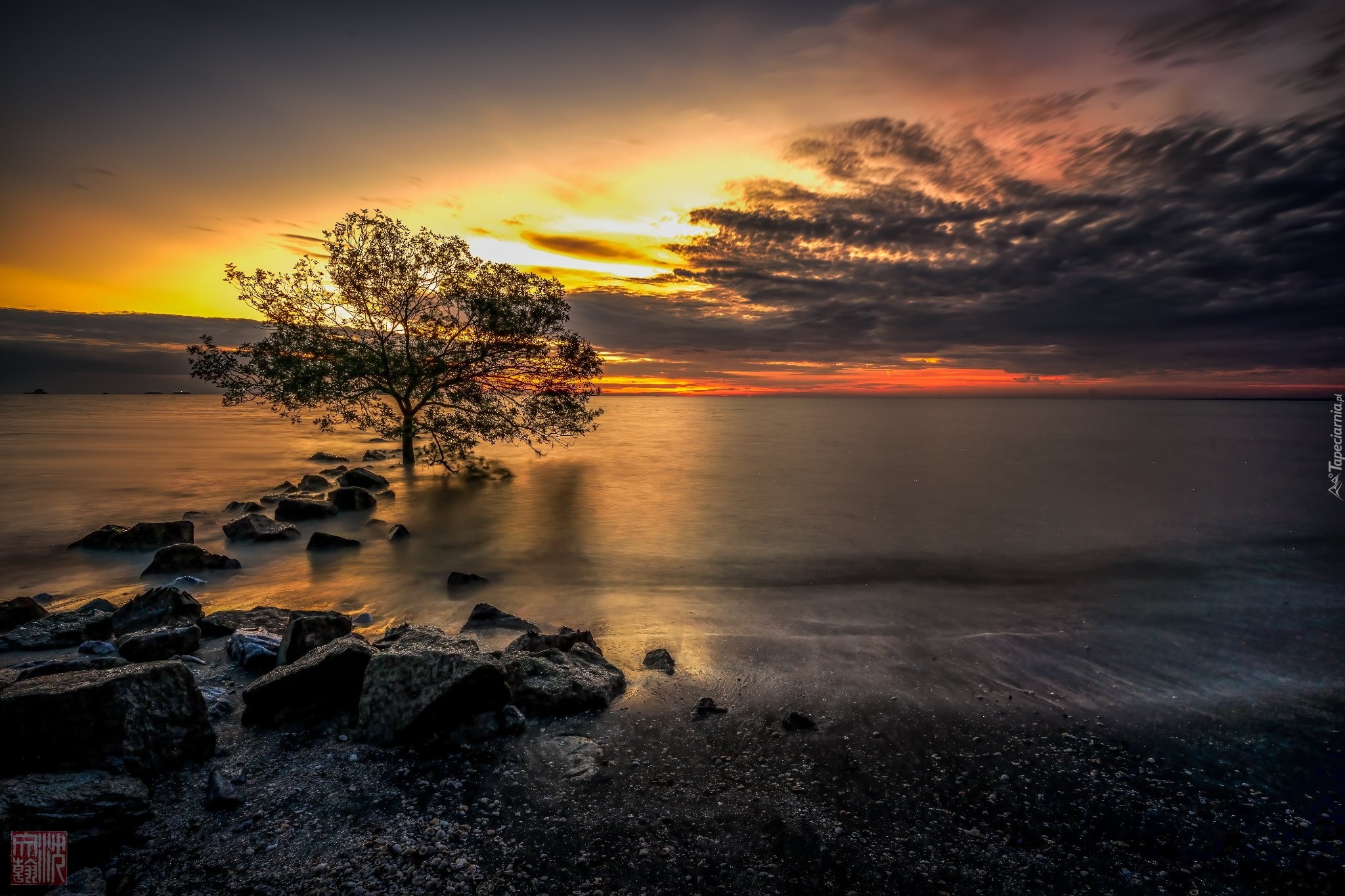 Edytor tapety: Kamienie i drzewo na brzegu morza