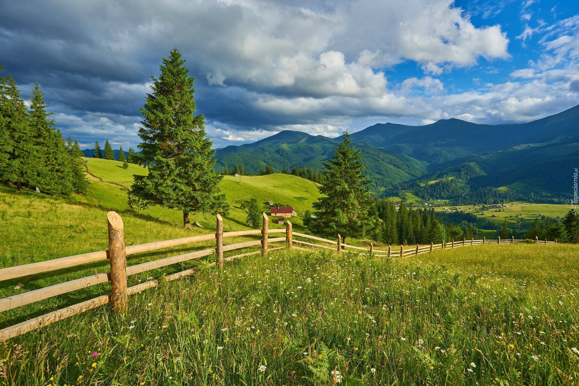 Edytor tapety: Ogrodzona łąka na tle chmur nad górami