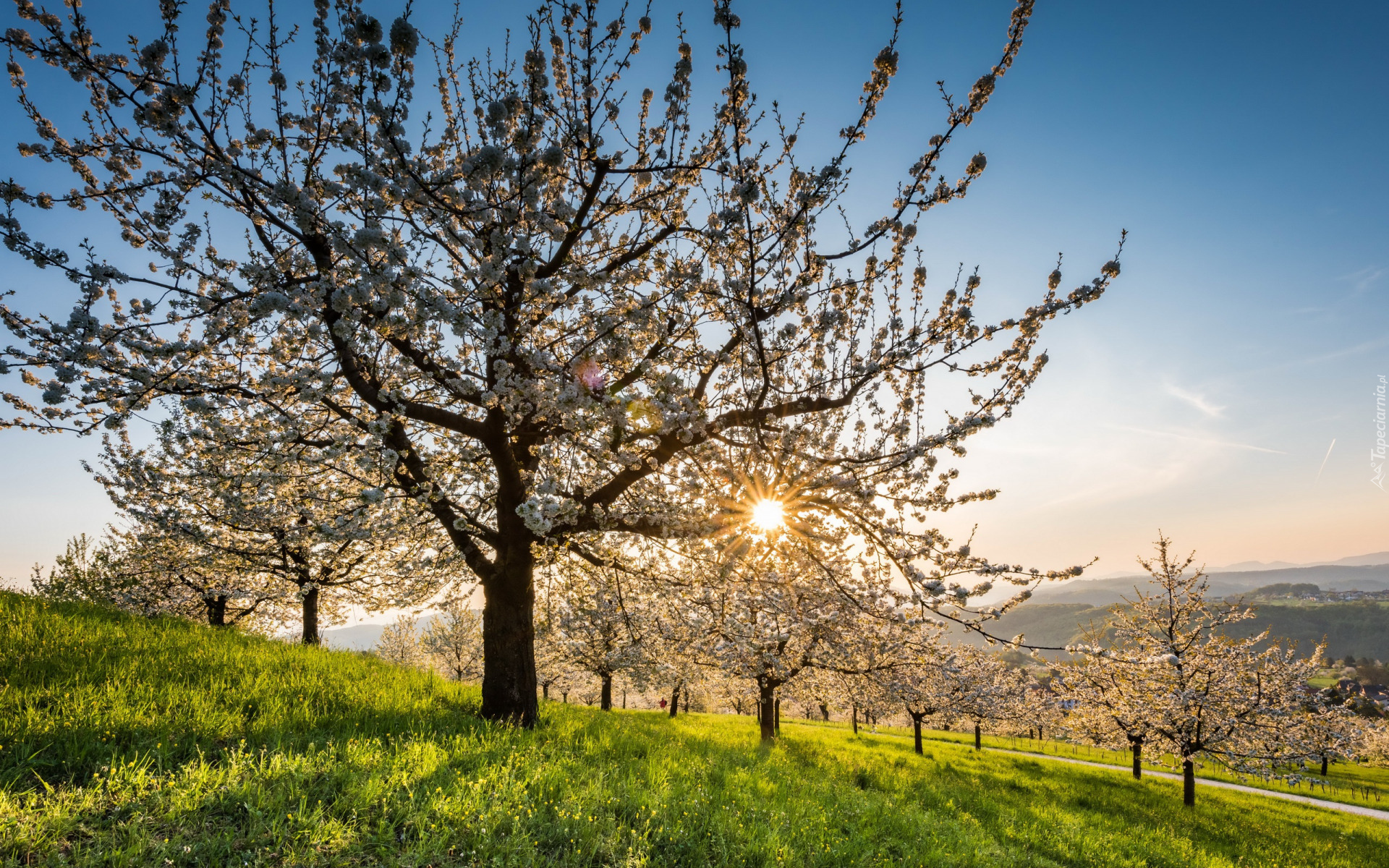 Edytor tapety: Kwitnące drzewa owocowe na wzgórzu