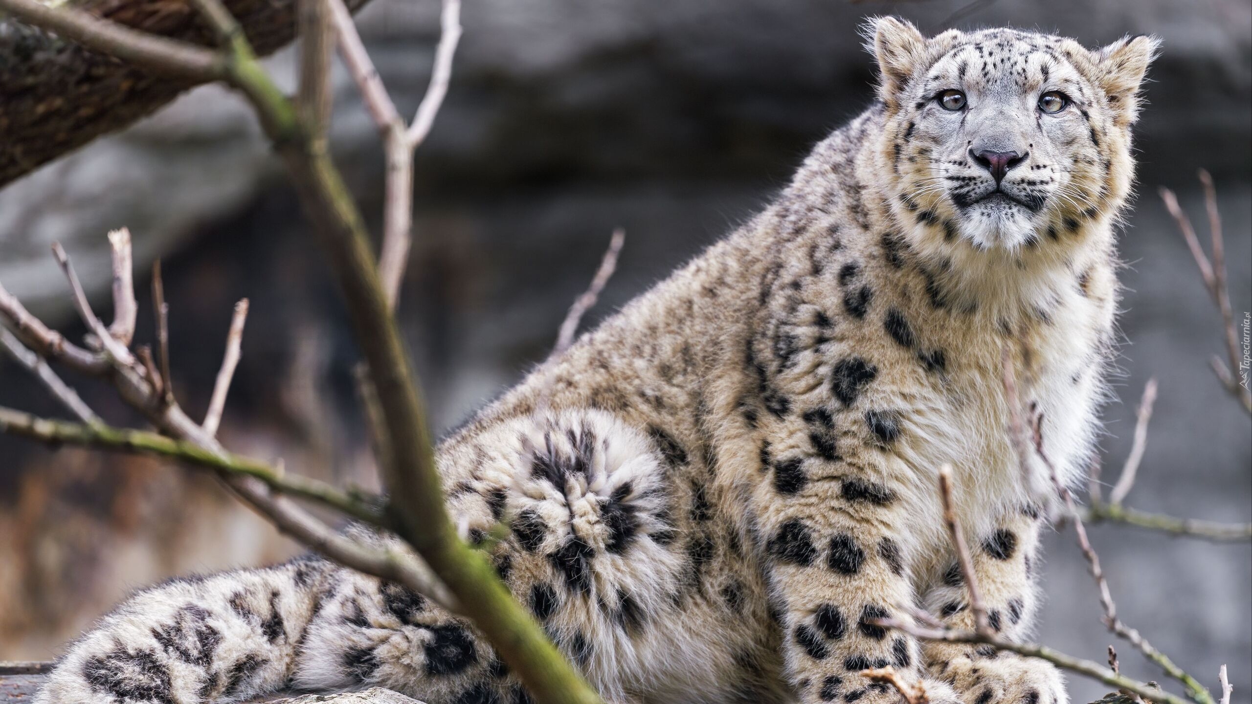 Edytor tapety: Irbis śnieżny obok gałęzi
