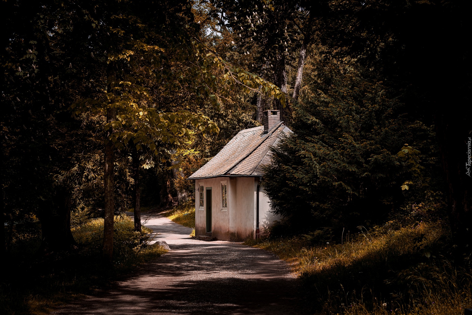 Edytor tapety: Mały domek pod drzewami przy leśnej drodze