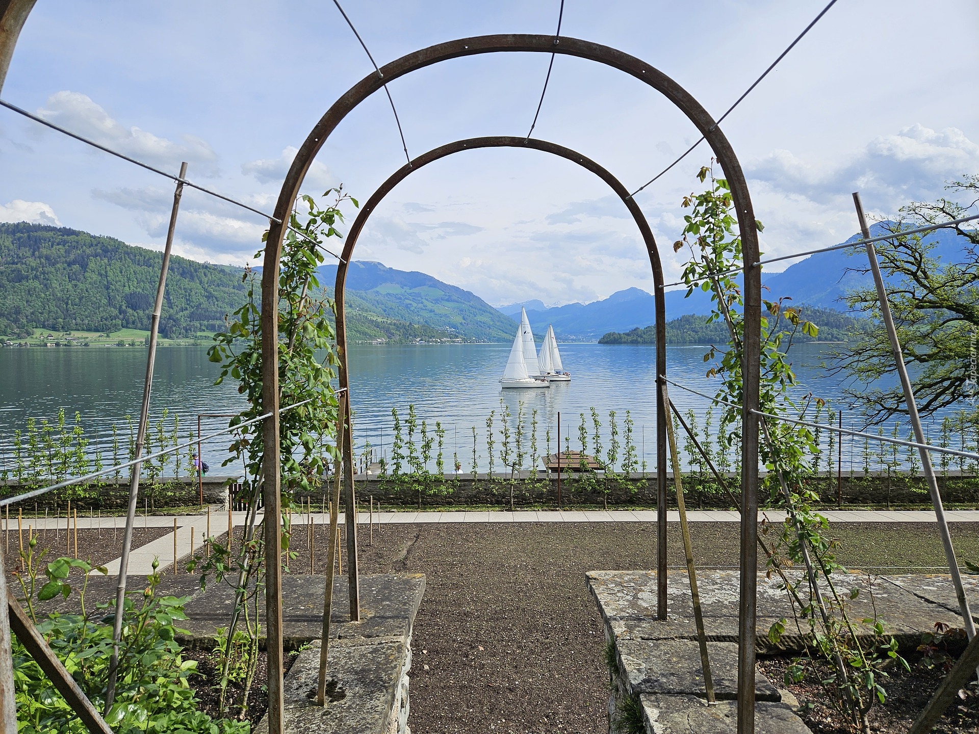 Edytor tapety: Pergola na tle jeziora i gór