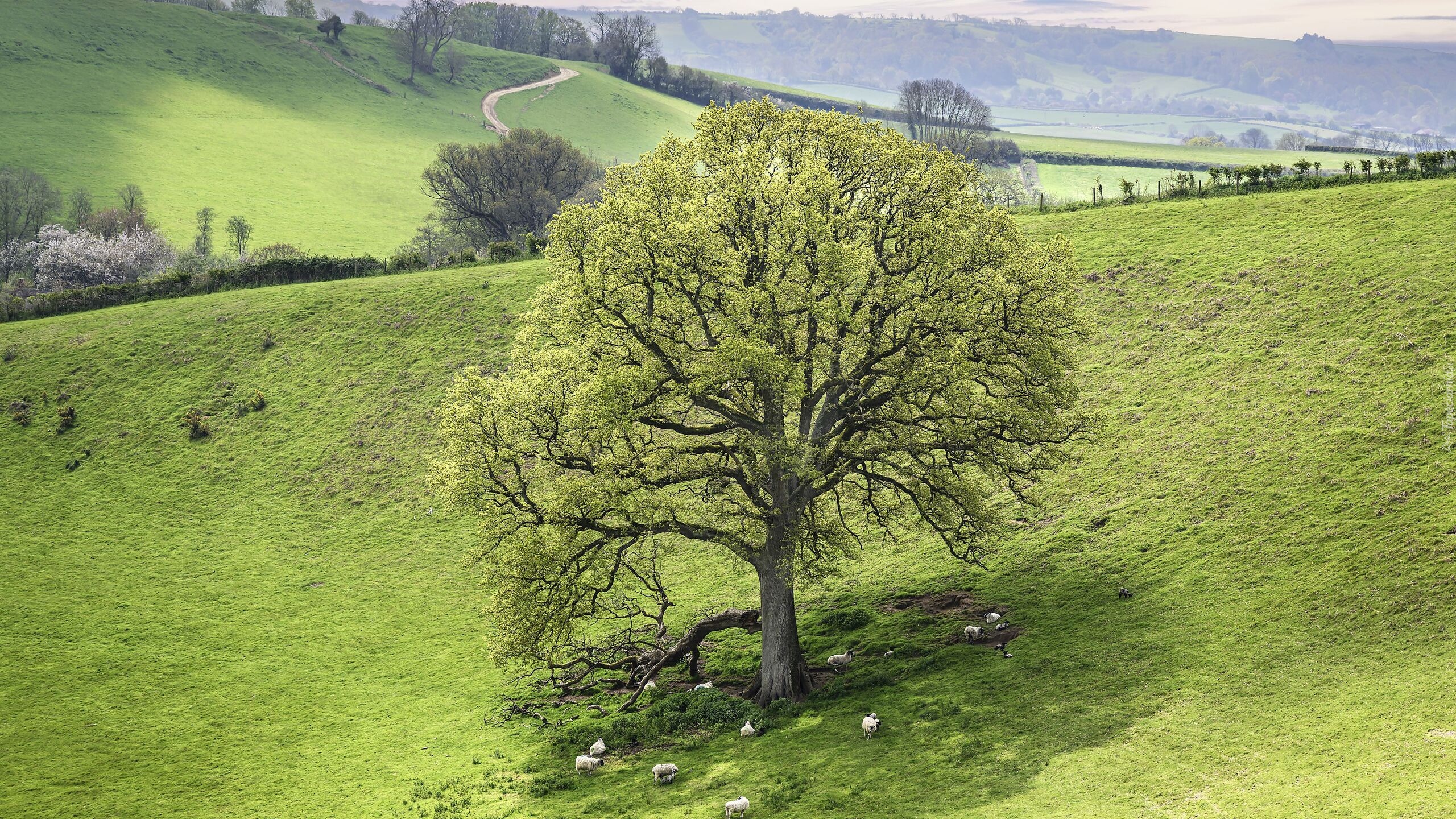 Edytor tapety: Owce pod drzewem na wzgórzu