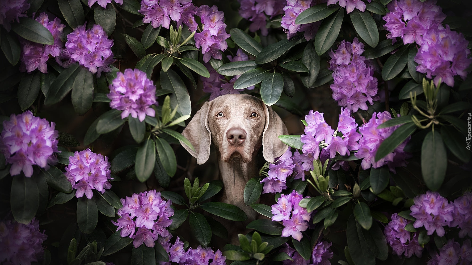Edytor tapety: Wyżeł weimarski wśród kwiatów rododendronu