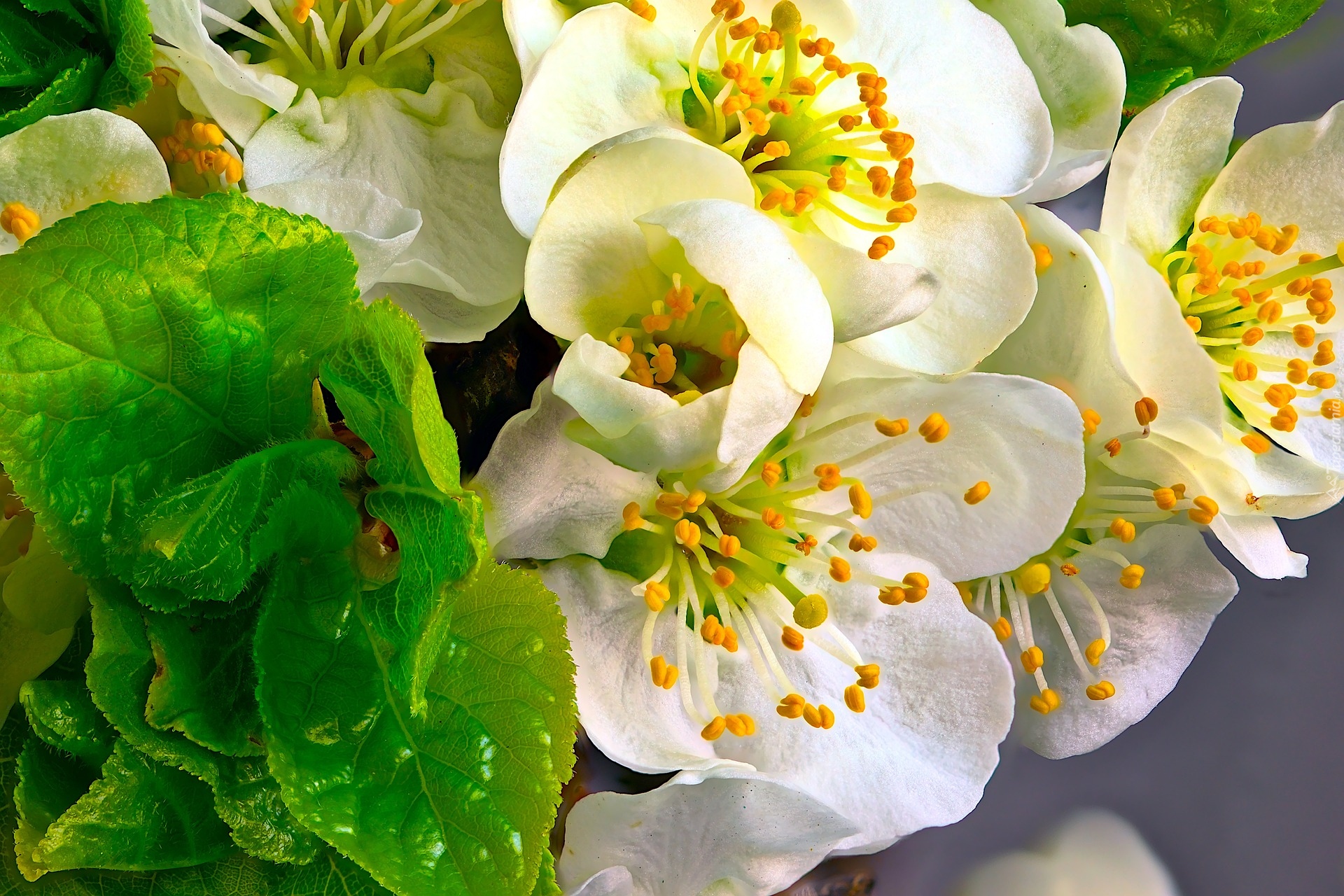 Edytor tapety: Białe kwiaty drzewa owocowego z pręcikami w zbliżeniu