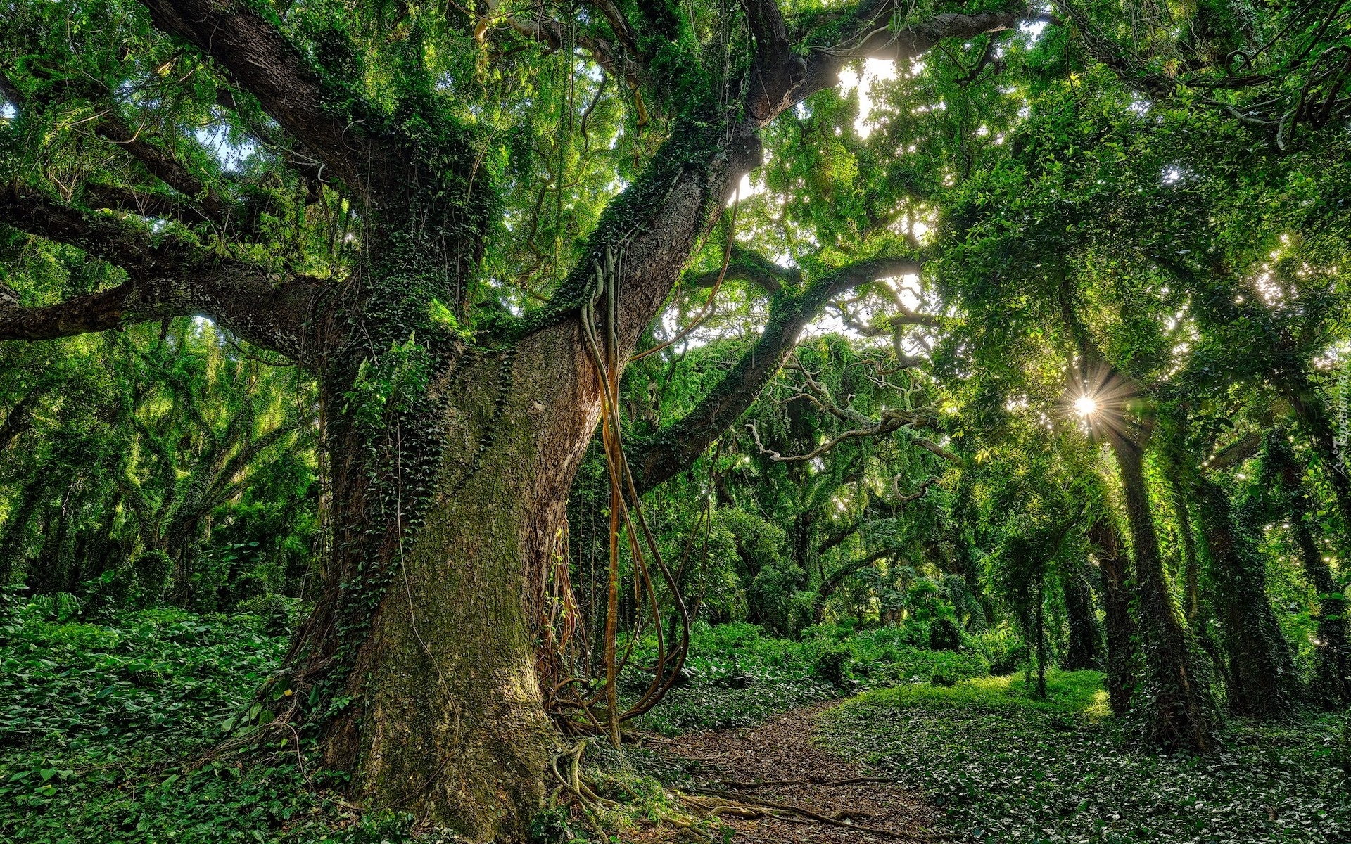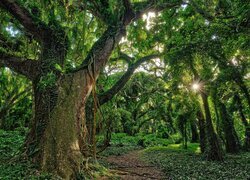 Edytor tapety: Drzewa oplecione bluszczem w promieniach słońca