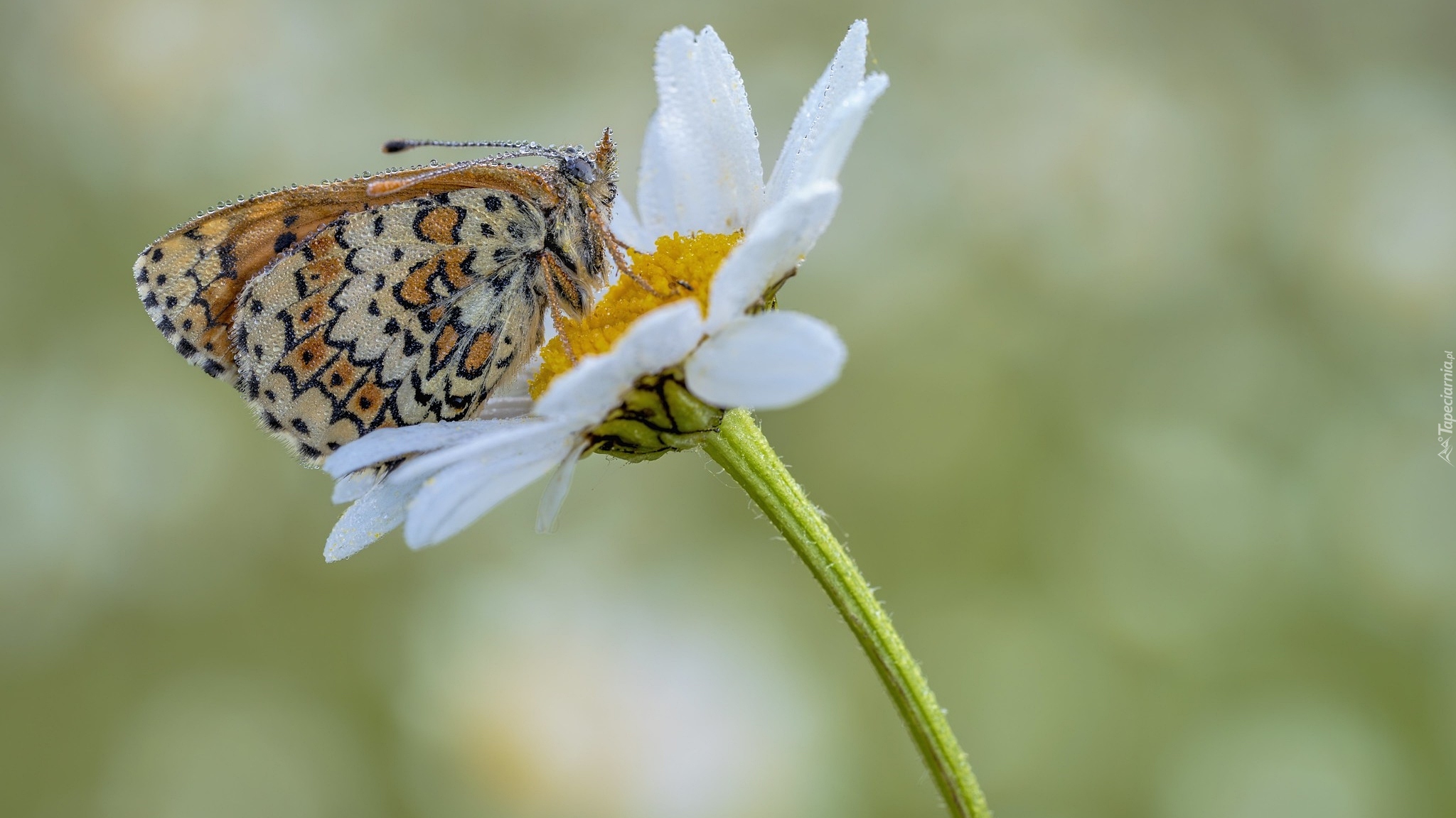 Edytor tapety: Mokra przeplatka febe na zroszonym białym kwiatku