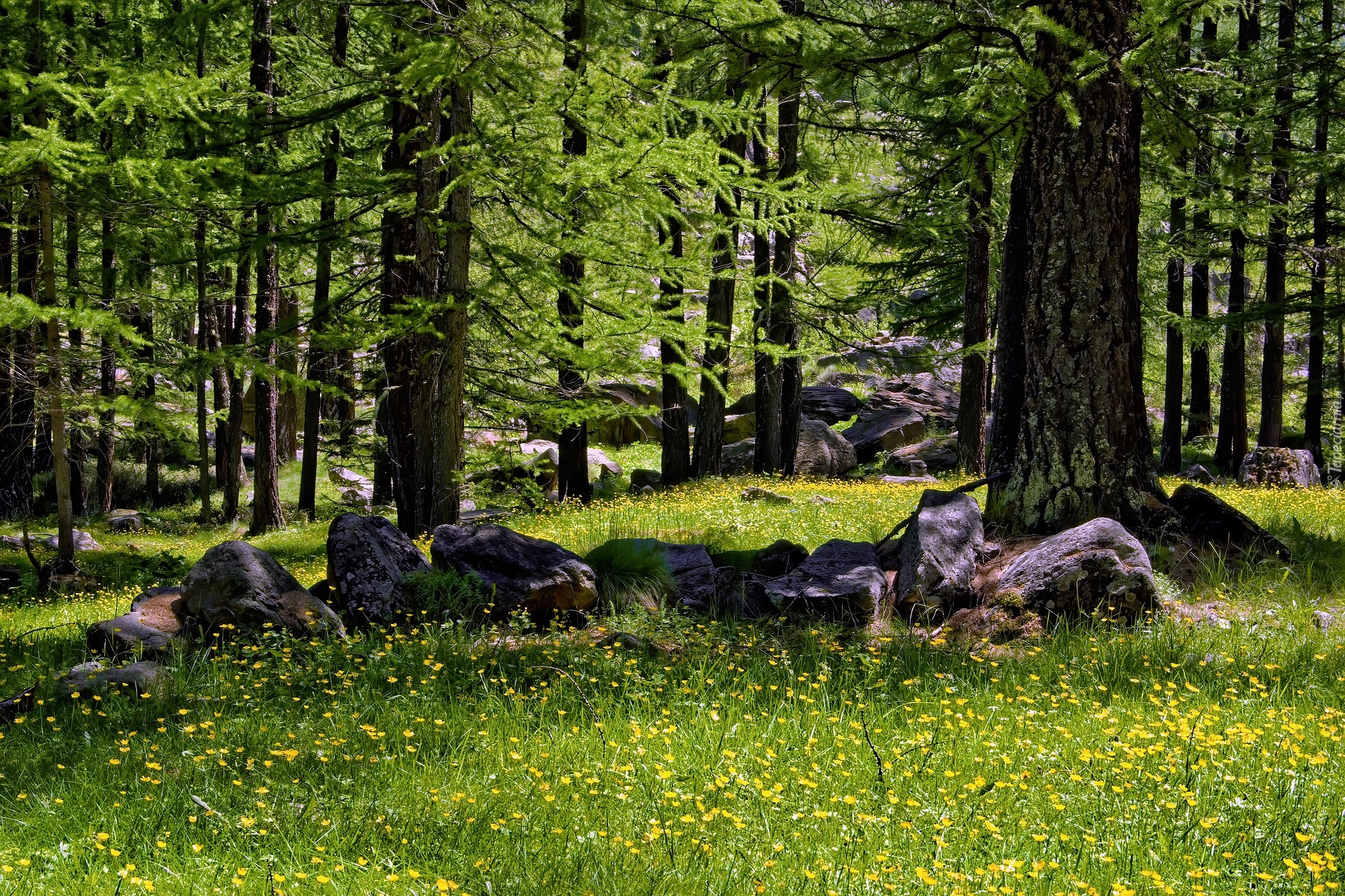 Edytor tapety: Kwiaty i głazy pod drzewami w lesie iglastym