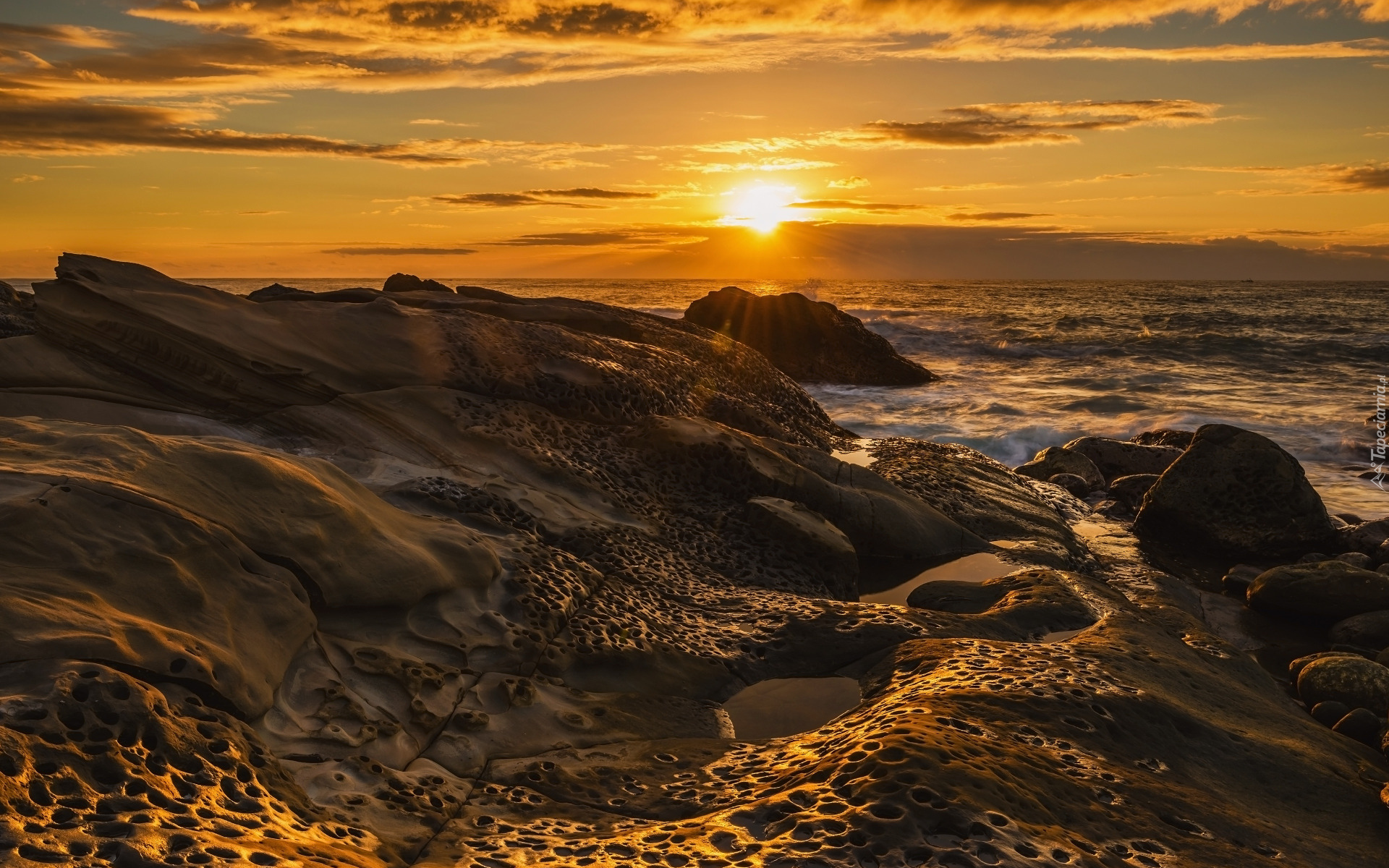 Edytor tapety: Skały w blasku zachodzącego słońca nad morzem