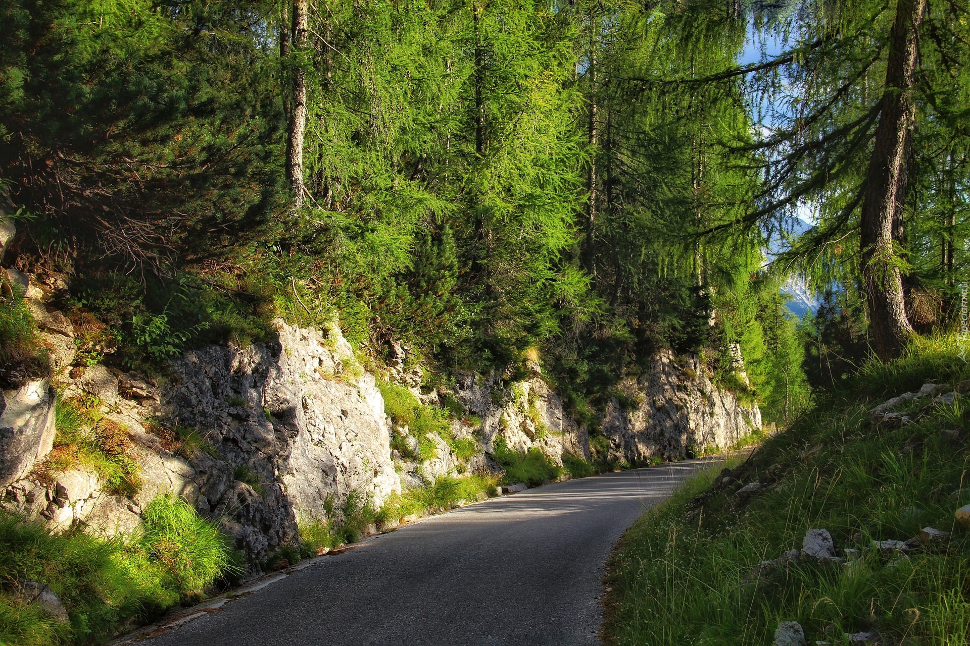 Edytor tapety: Drzewa iglaste na skałach przy drodze