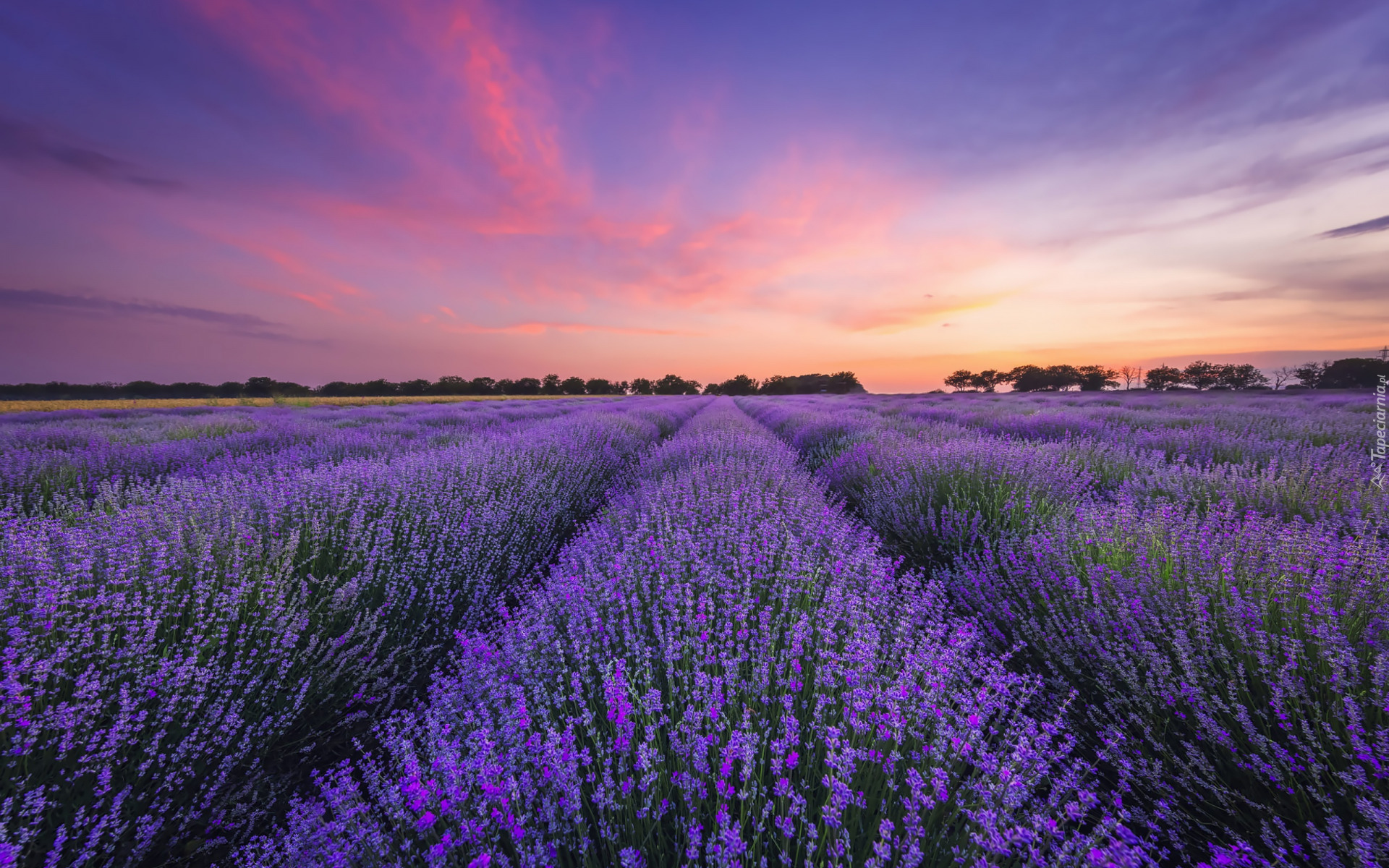 Edytor tapety: Zaróżowione o poranku niebo nad polem lawendy