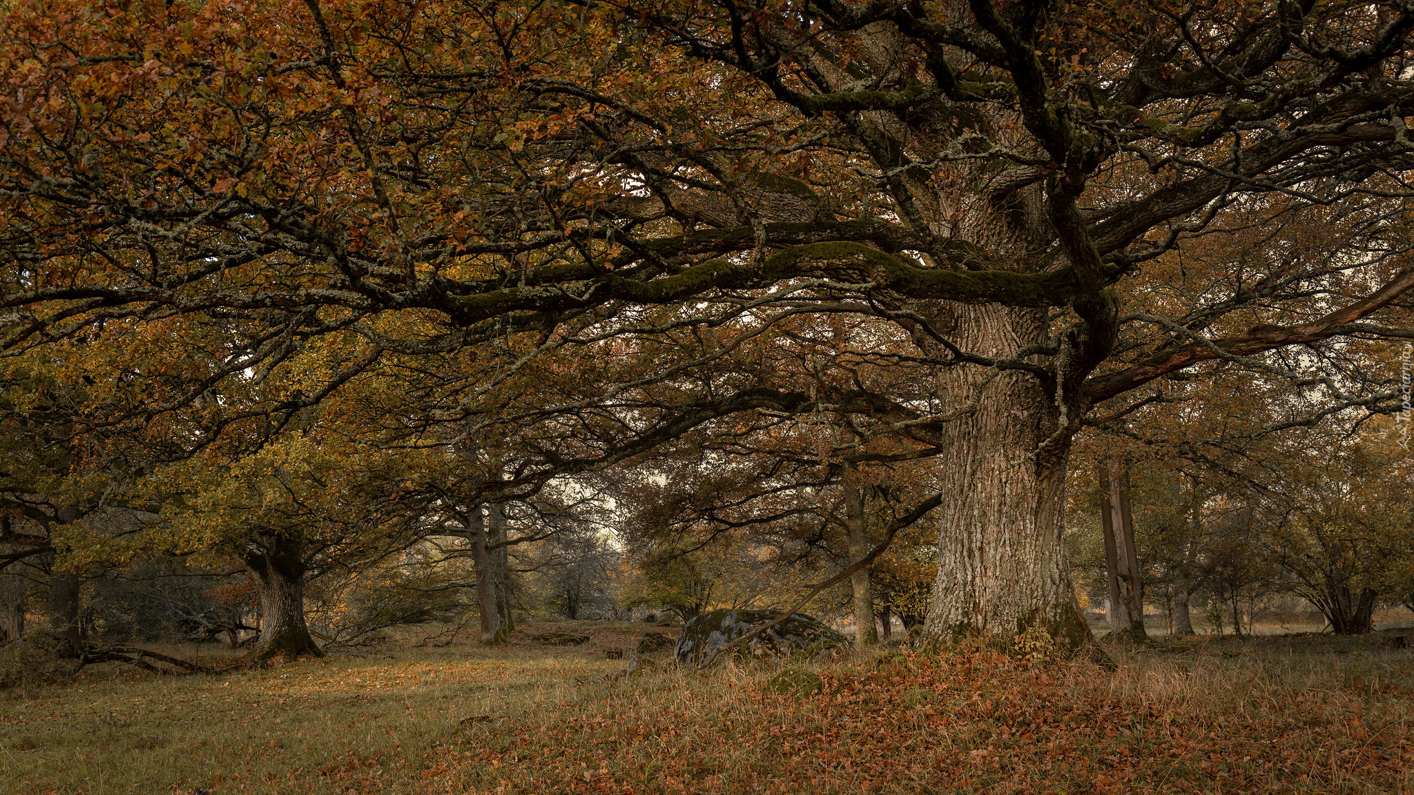 Edytor tapety: Rozłożysty stary dąb z jesiennymi liśćmi