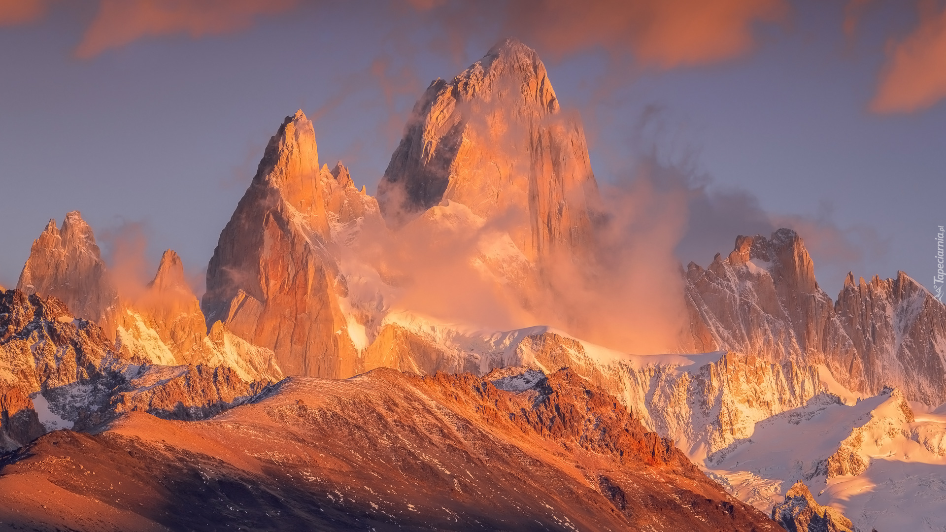 Edytor tapety: Mgła wokół rozświetlonego szczytu Fitz Roy