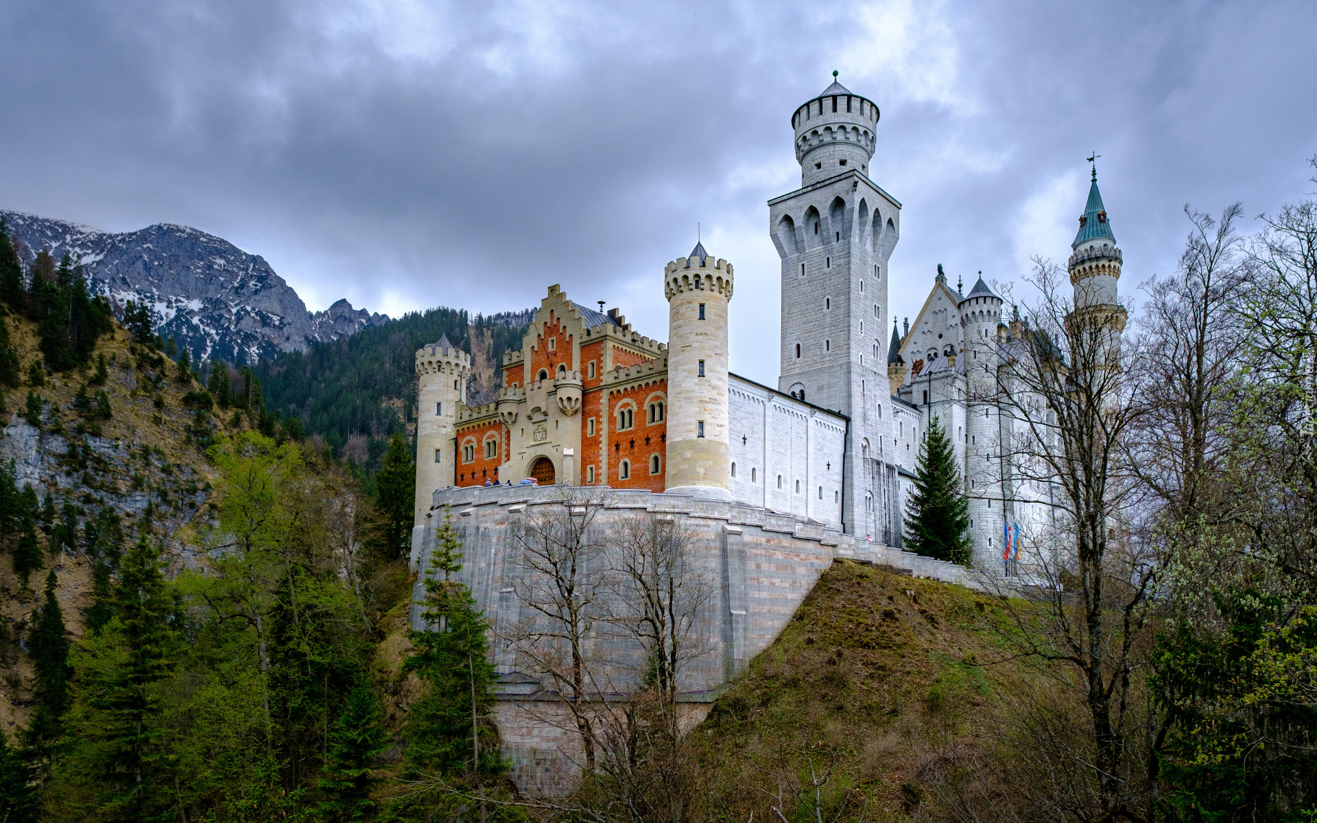 Edytor tapety: Zamek Neuschwanstein otoczony drzewami na tle Alp Bawarskich