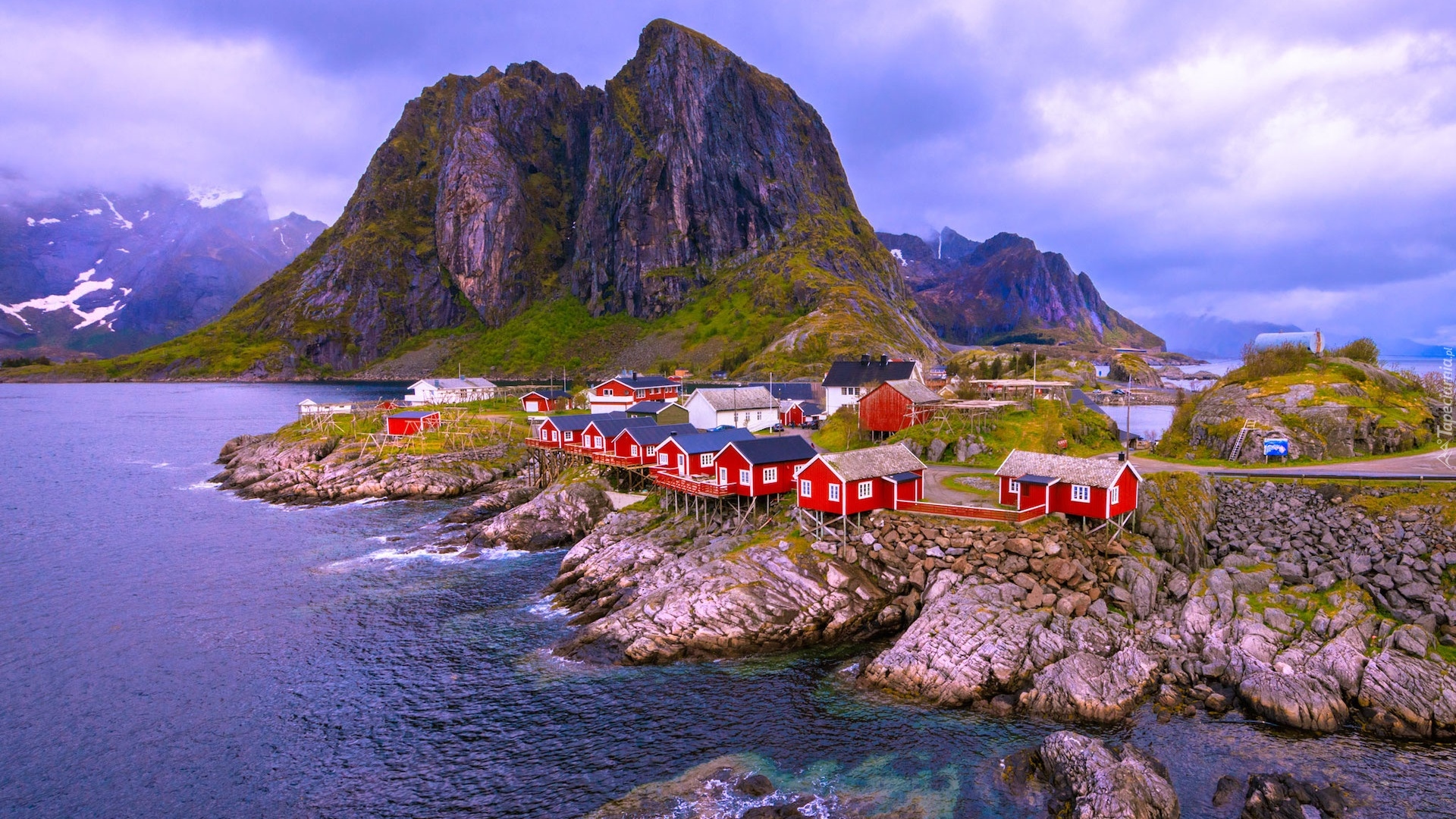 Edytor tapety: Czerwone domy w wiosce Hamnoy na Lofotach