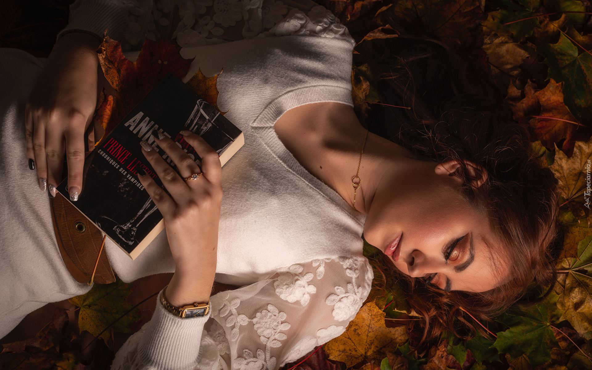 Edytor tapety: Kobieta z książką leżąca na liściach