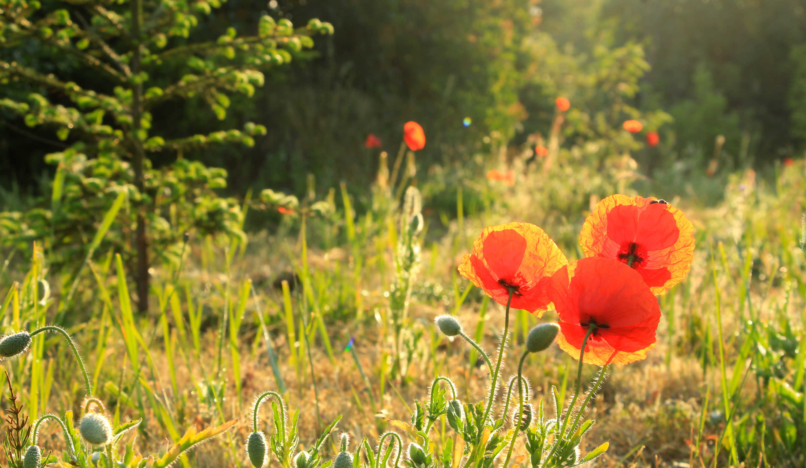 Edytor tapety: Rozświetlone czerwone maki na łące
