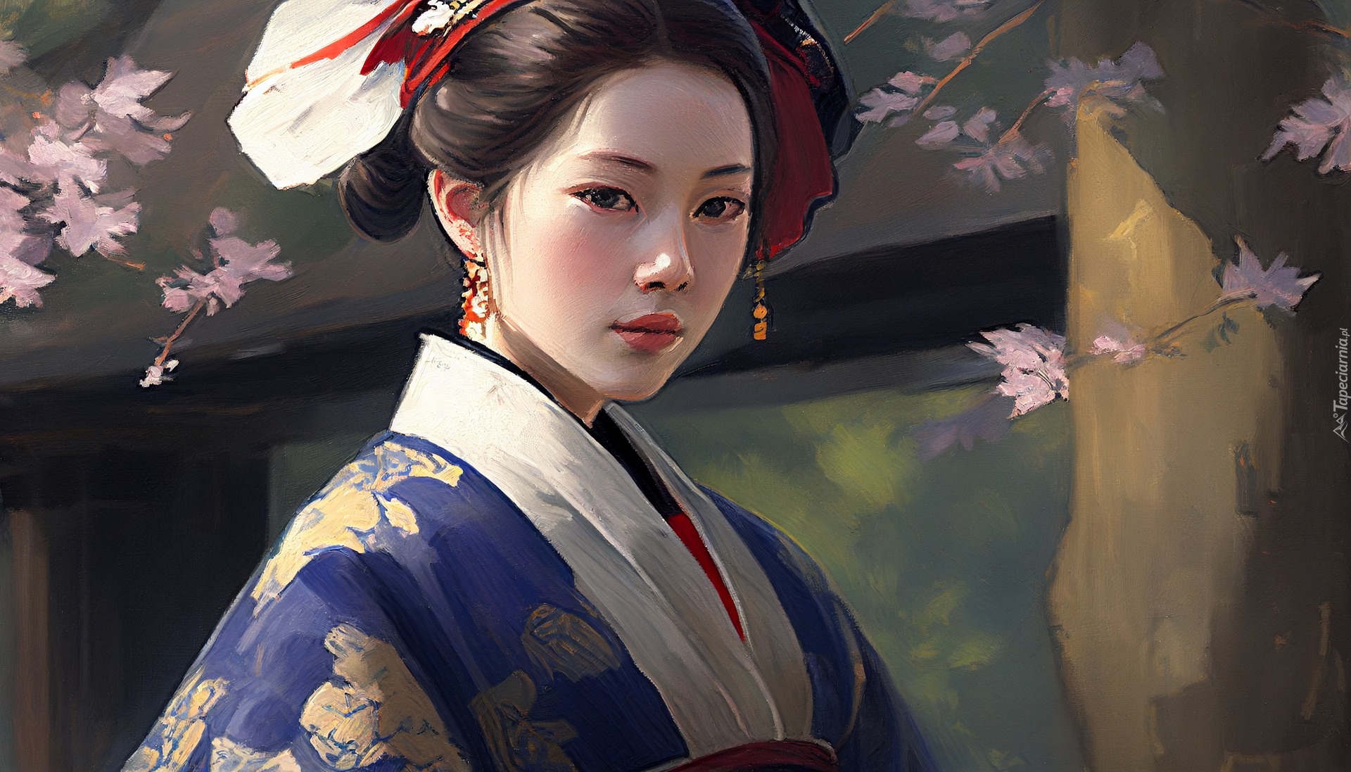 Edytor tapety: Japonka w kimono na obrazie olejnym