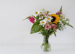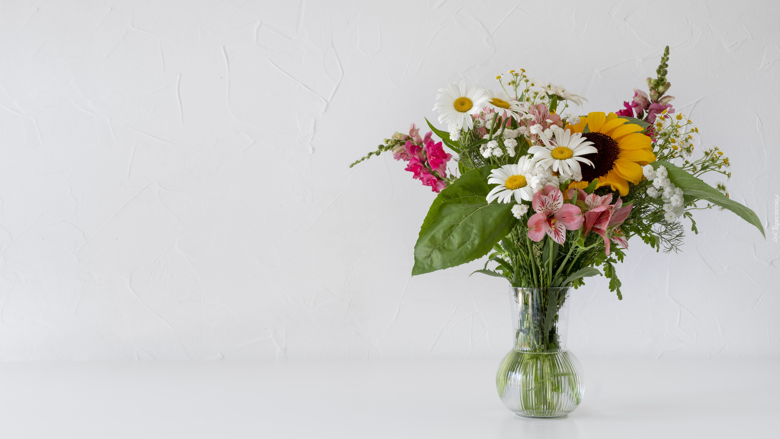 Edytor tapety: Różnorodne kwiaty w szklanym wazonie