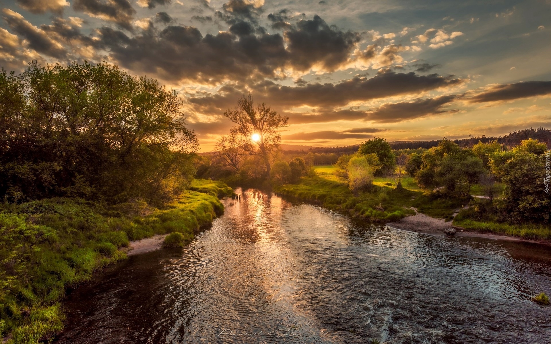 Edytor tapety: Ciemne chmury i zachód słońca nad rzeką