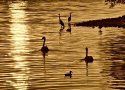 Edytor tapety: Łabędzie i czaple na wodzie w blasku wschodzącego słońca