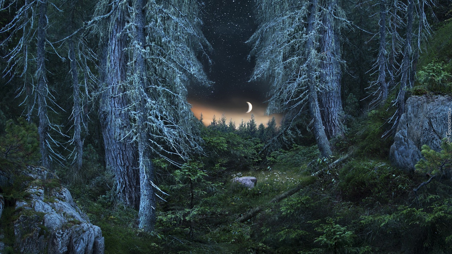 Edytor tapety: Księżycowa noc nad lasem iglastym