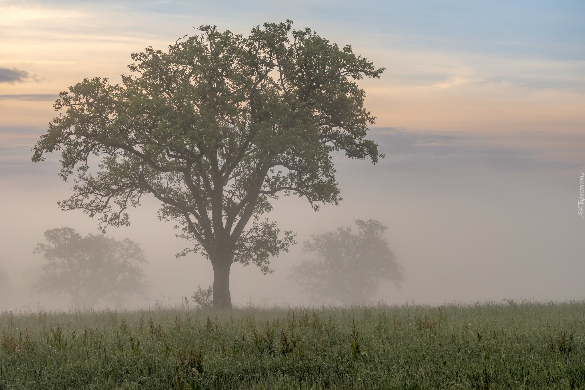 Edytor tapety: Drzewo na zamglonej łące o poranku