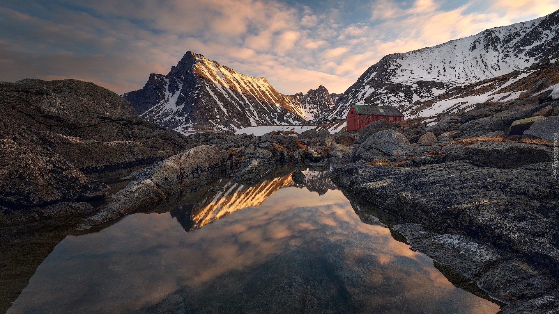 Edytor tapety: Drewniana szopa na skałach nad górskim jeziorem