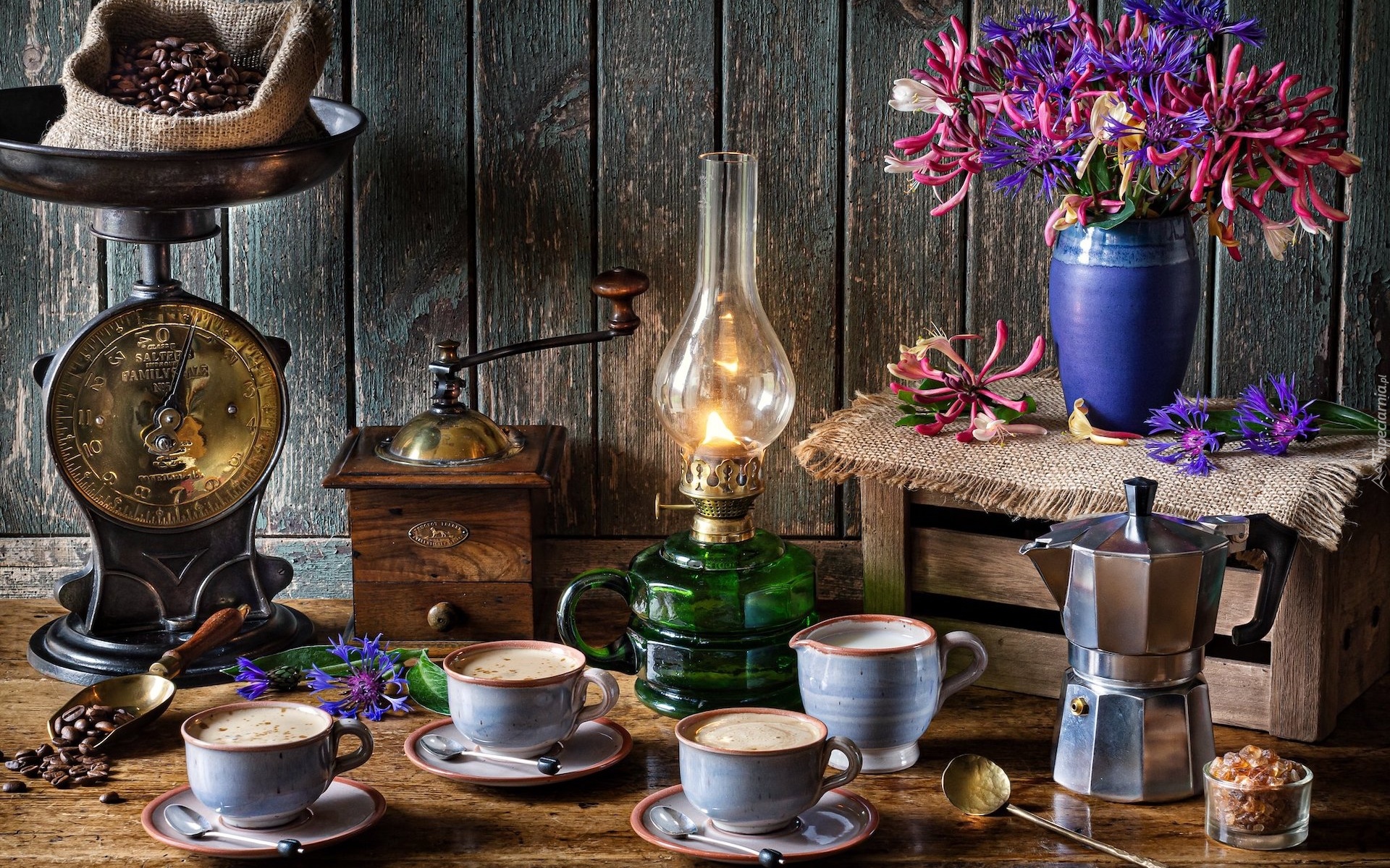 Edytor tapety: Filiżanki z kawą obok młynka i wagi
