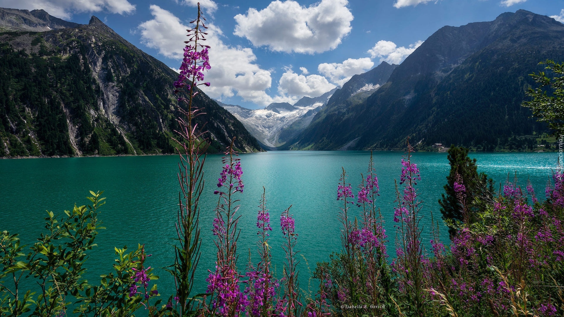 Edytor tapety: Różowe kwiaty nad jeziorem i góry w oddali