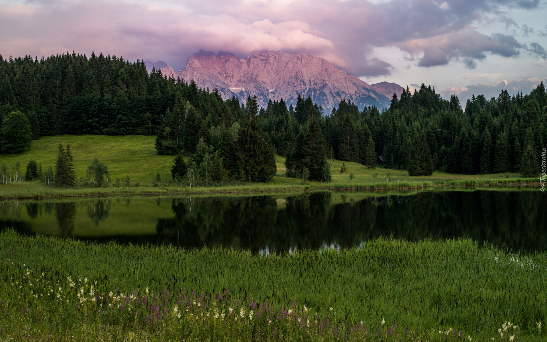 Edytor tapety: Chmury nad górami i drzewa nad jeziorem