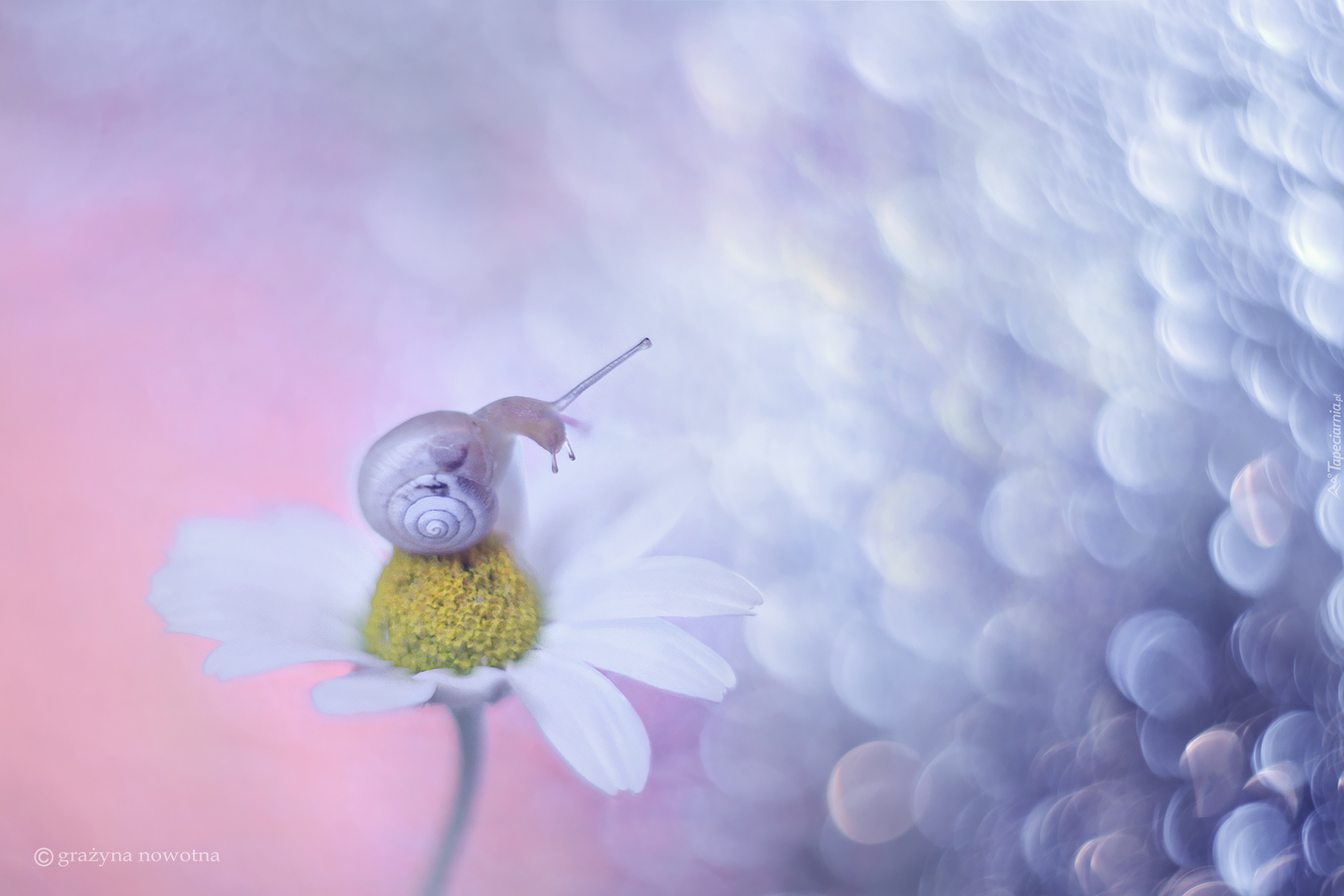 Edytor tapety: Ślimak na białym kwiatku rumianu polnego