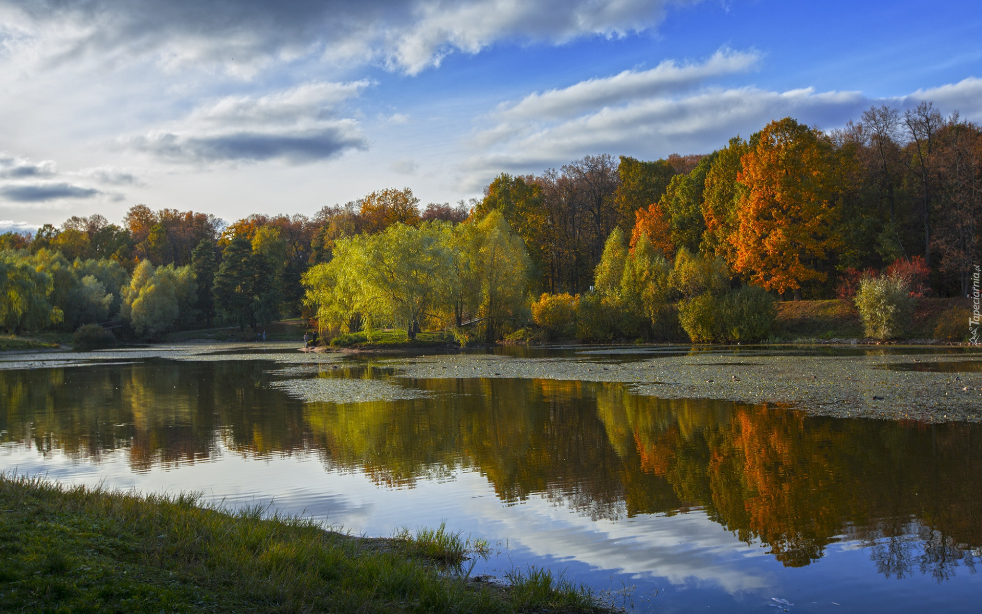 Edytor tapety: Kolorowe jesienne drzewa nad stawem w parku