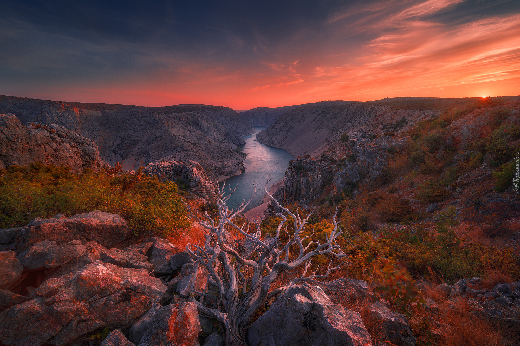 Edytor tapety: Zachodzące słońce nad kanionem i rzeką Zrmanja