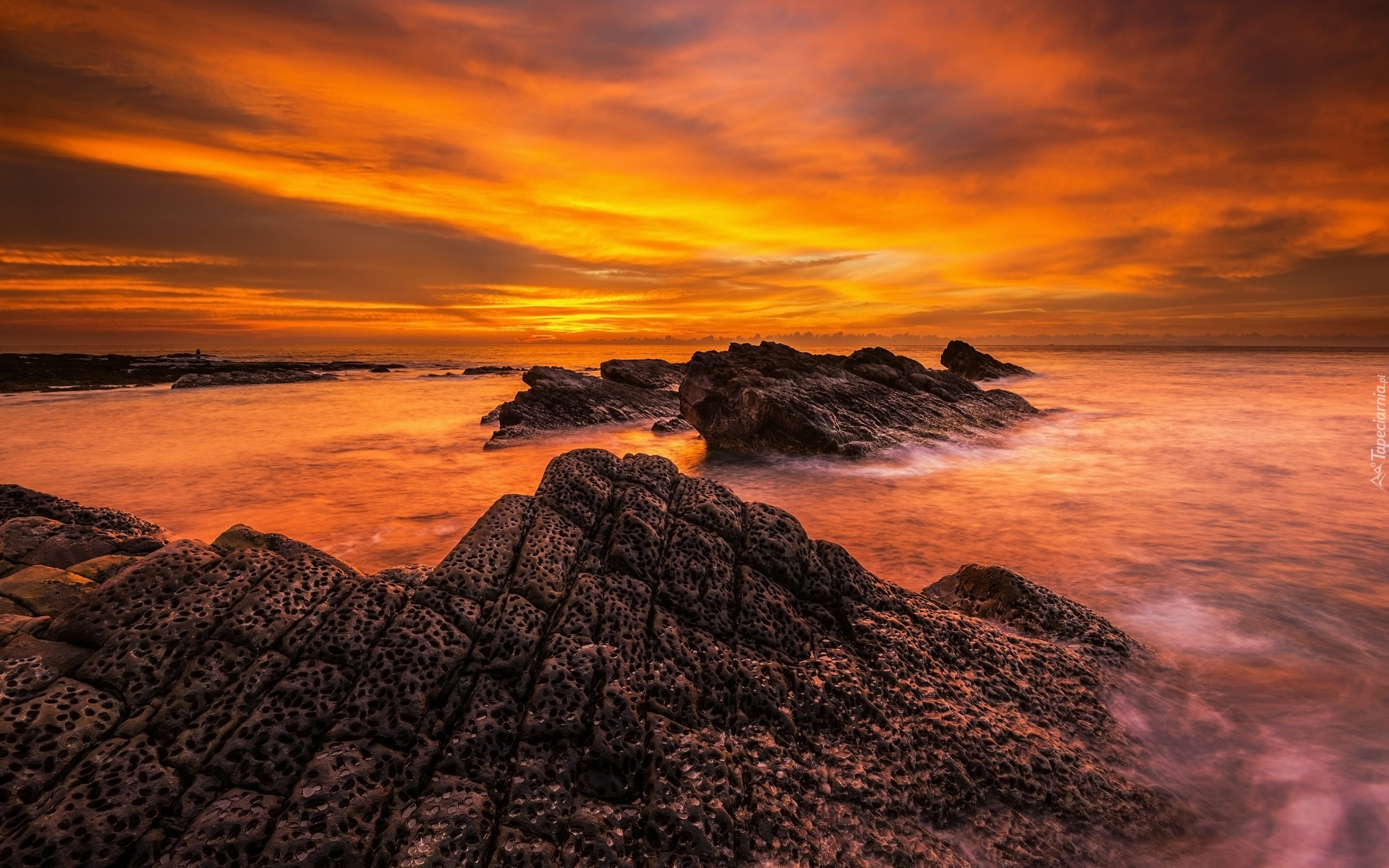 Edytor tapety: Kolorowe niebo nad skałami w morzu