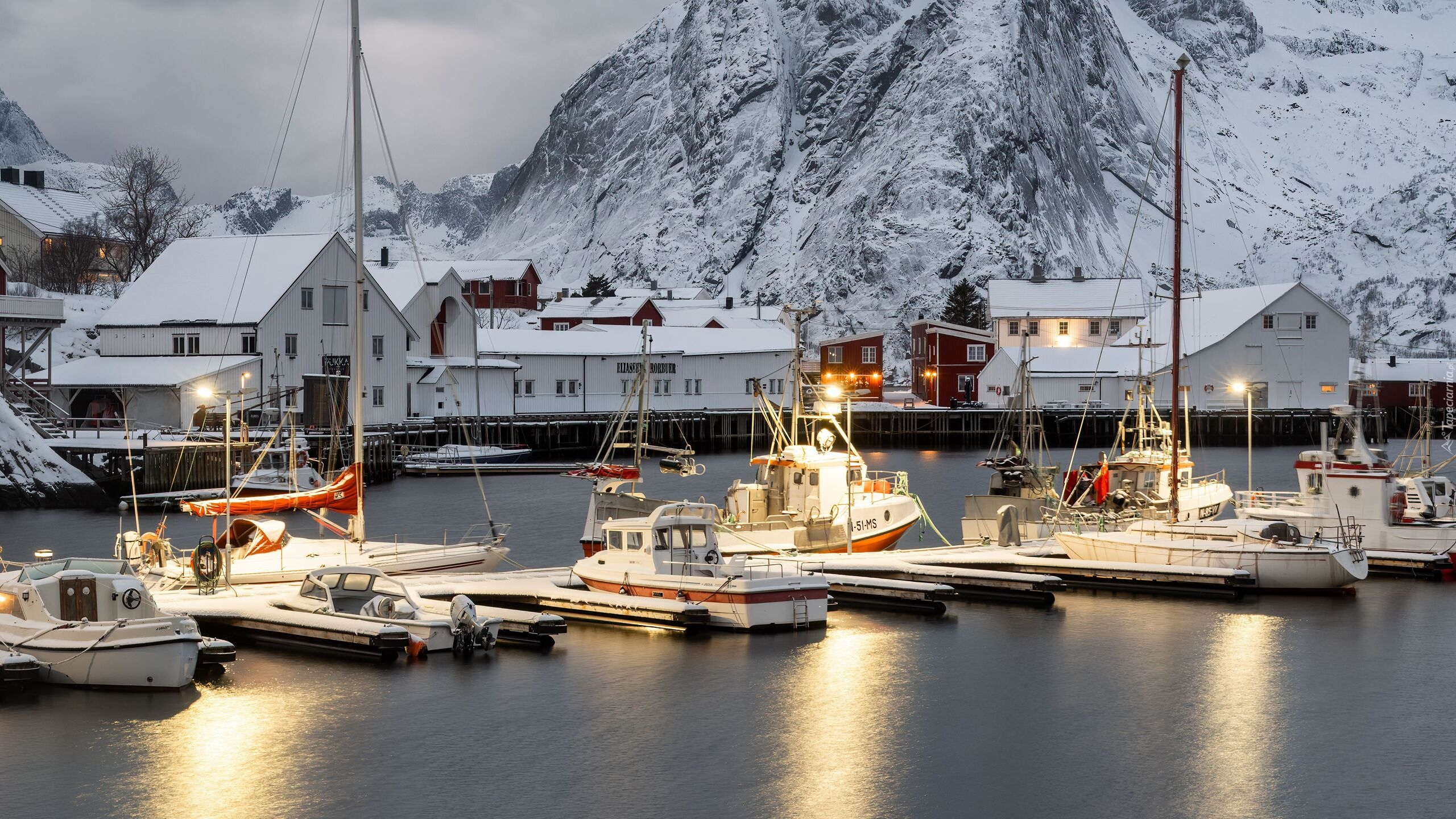 Edytor tapety: Motorówki w przystani na tle ośnieżonej góry