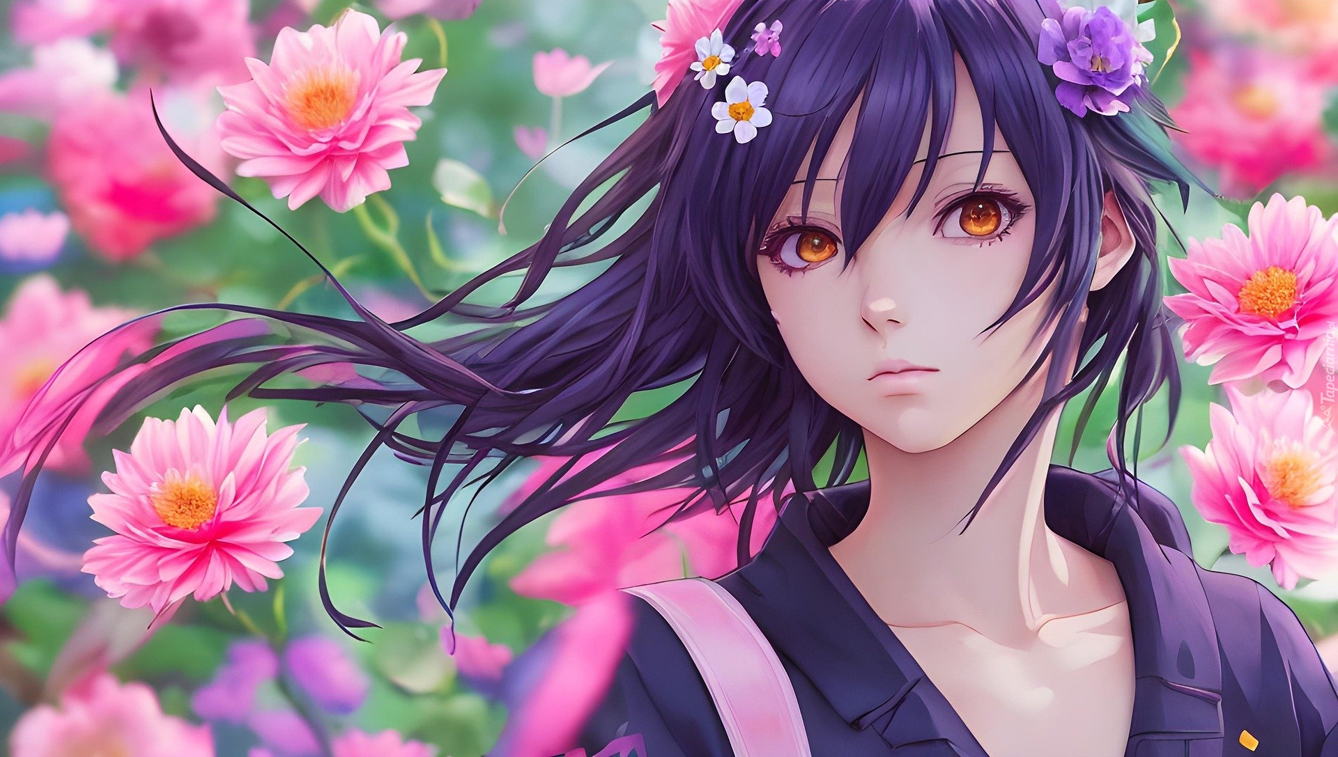 Edytor tapety: Dziewczyna z kwiatami w długich fioletowych włosach