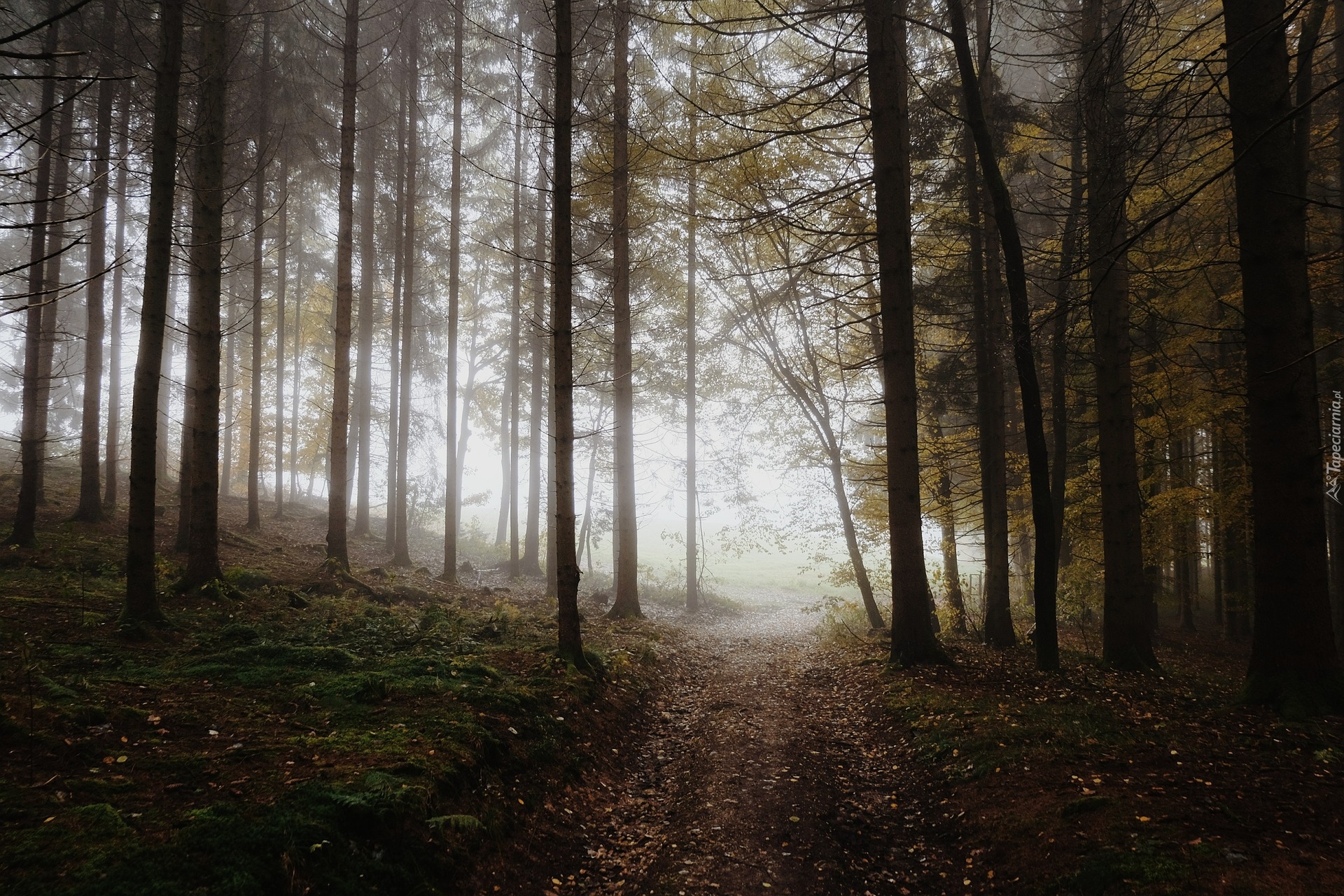 Edytor tapety: Ścieżka w zamglonym o poranku lesie iglastym