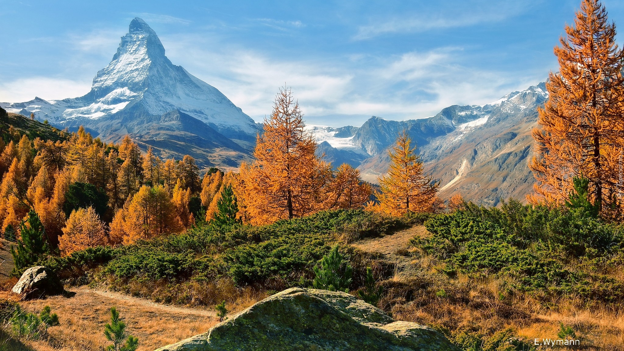 Edytor tapety: Rośliny i drzewa na tle szczytu Matterhorn